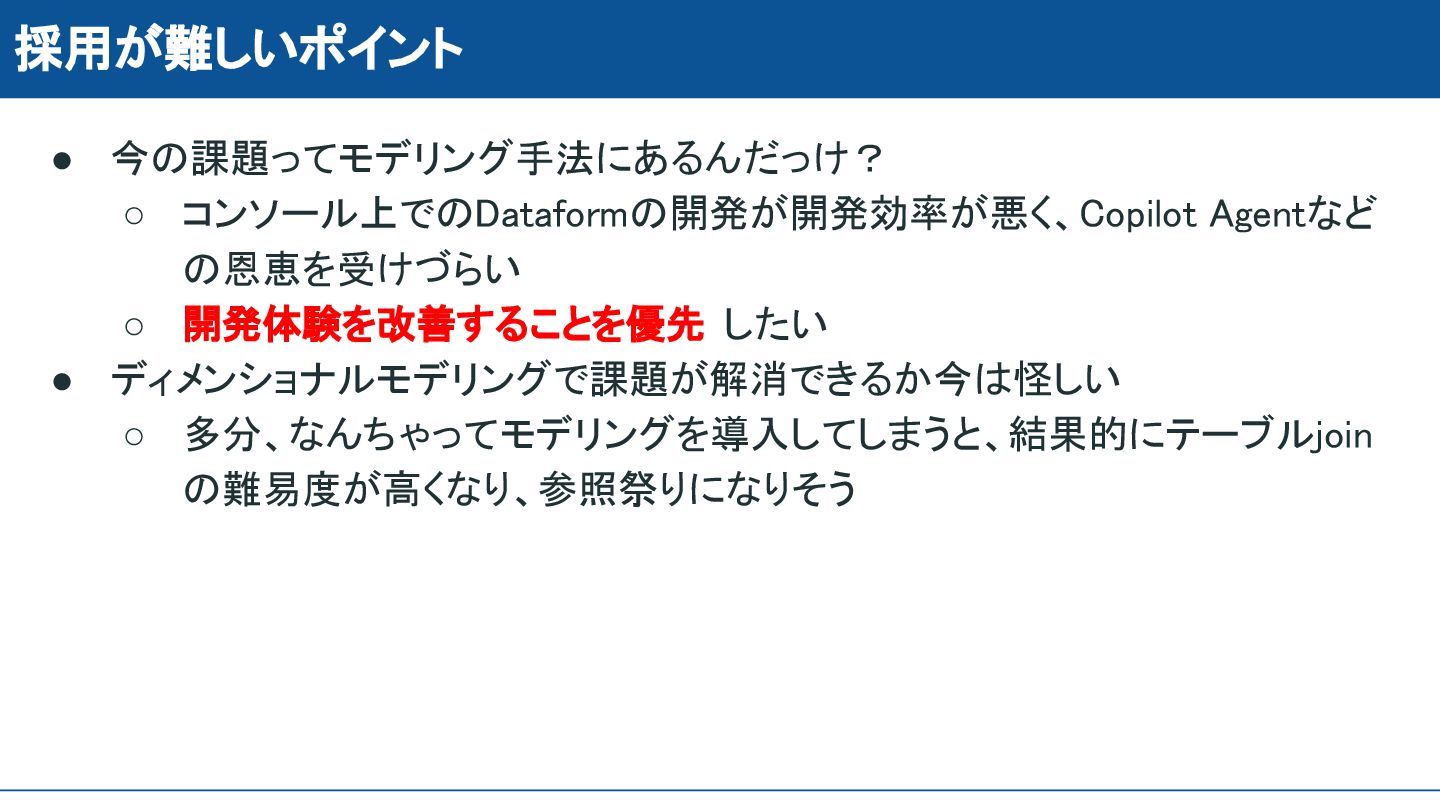 採用が難しいポイント • 今の課題ってモデリング手法にあるんだっけ? ◦ コンソール上でのDataformの開発が開発効率が悪く、Copilot Agentなど の恩恵を受けづらい ◦ 開発体験を改善することを優先