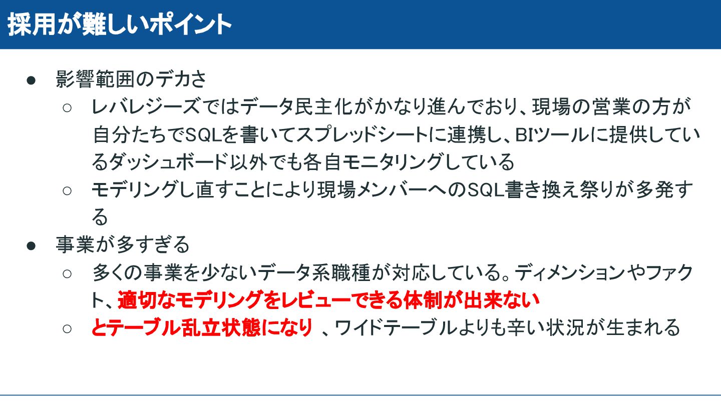 採用が難しいポイント • 影響範囲のデカさ ◦ レバレジーズではデータ民主化がかなり進んでおり、現場の営業の方が 自分たちでSQLを書いてスプレッドシートに連携し、BIツールに提供してい るダッシュボード以外でも各自モニタリングしている ◦ モデリングし直すことにより現場メンバーへのSQL書き換え祭りが多発す