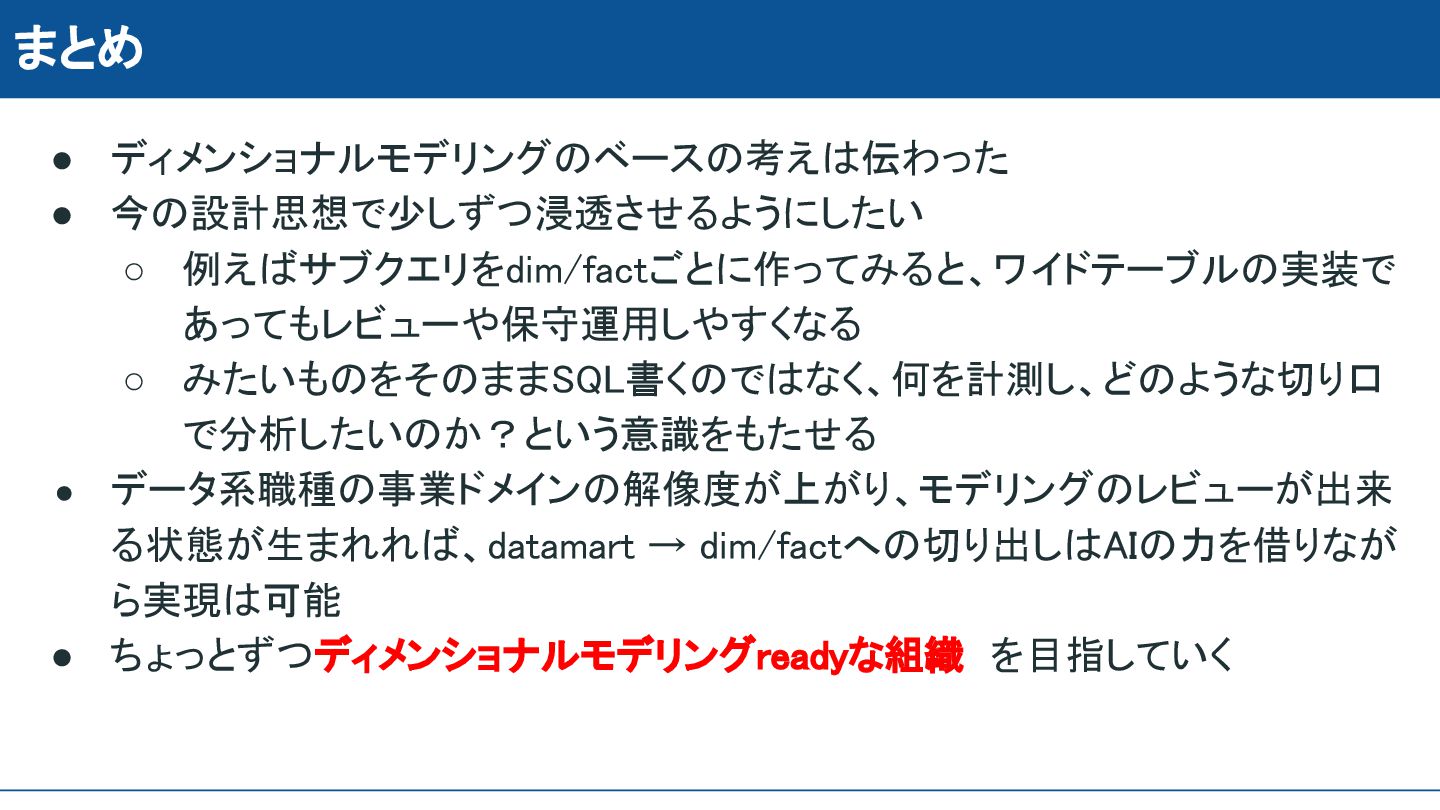 まとめ • ディメンショナルモデリングのベースの考えは伝わった • 今の設計思想で少しずつ浸透させるようにしたい ◦ 例えばサブクエリをdim/factごとに作ってみると、ワイドテーブルの実装で あってもレビューや保守運用しやすくなる ◦ みたいものをそのままSQL書くのではなく、何を計測し、どのような切り口