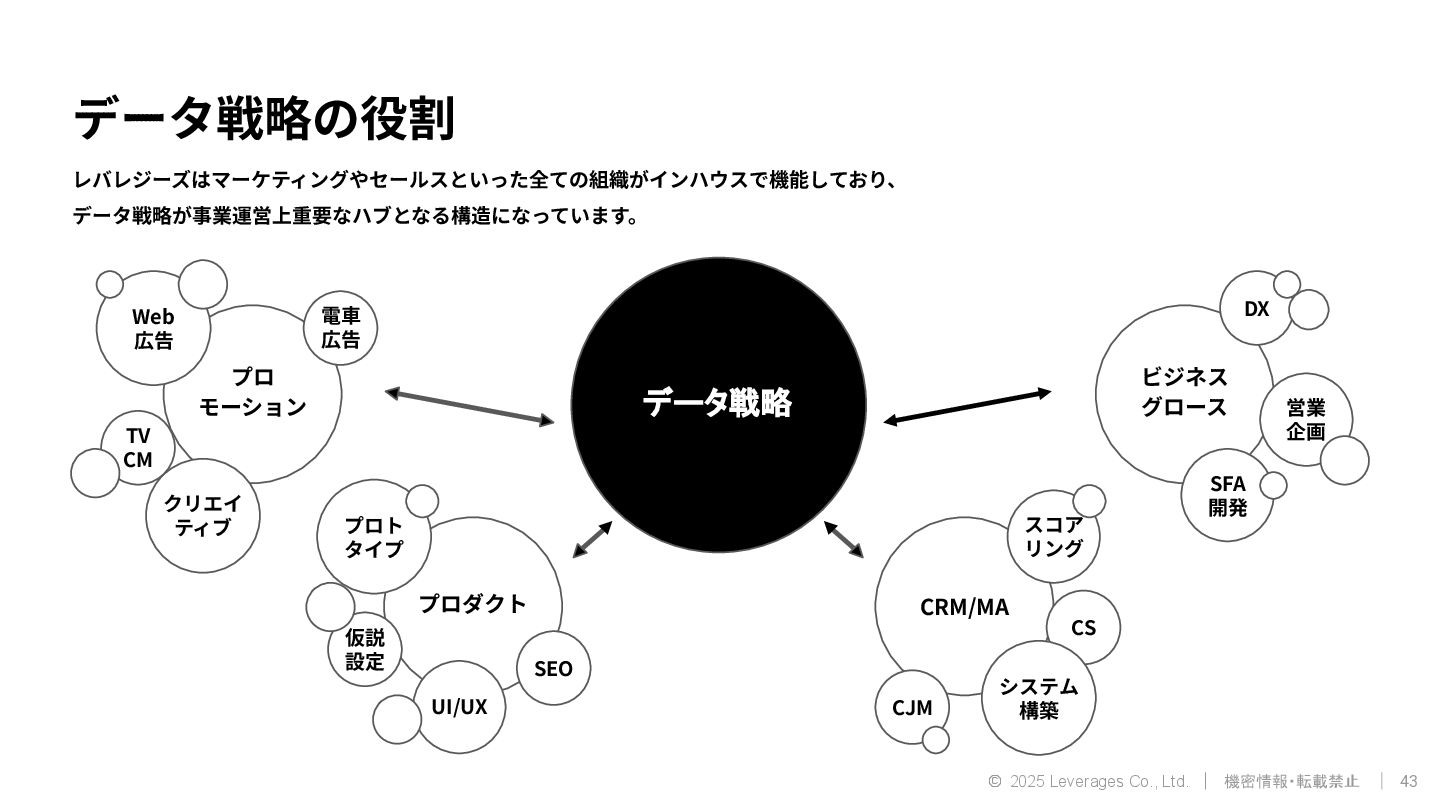 営業 企画 SFA 開発 CRM/MA CJM スコア リング CS システム 構築 プロ モーション プロダクト UI/UX SEO プロト タイプ Web 広告 クリエイ ティブ TV CM 電⾞ 広告 仮説 設定 レバレジーズはマーケティングやセールスといった全ての組織がインハウスで機能しており、 データ戦略が事業運営上重要なハブとなる構造になっています。 データ戦略の役割 データ戦略