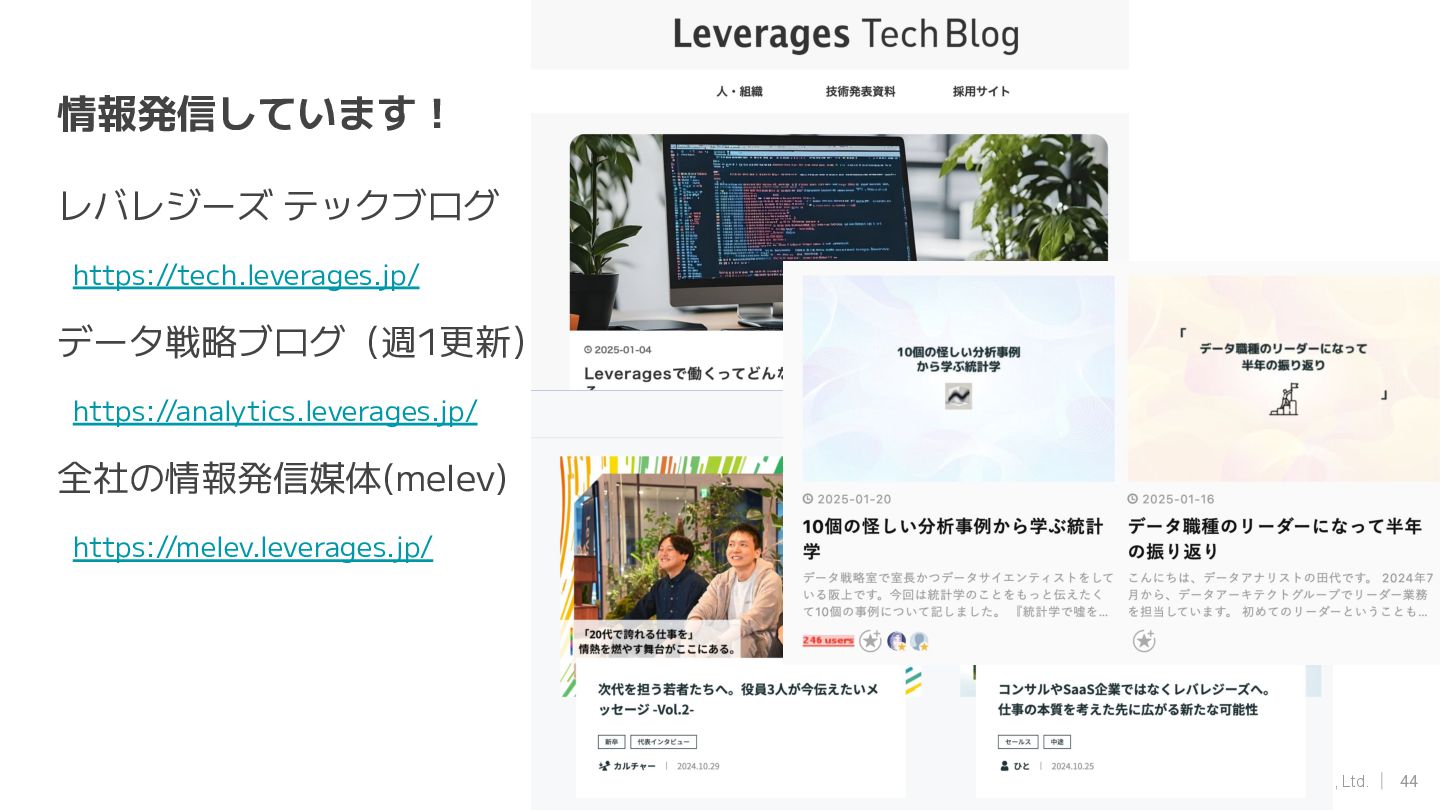 44 © 2025 Leverages Co., Ltd. レバレジーズ テックブログ https://tech.leverages.jp/ データ戦略ブログ(週1更新)