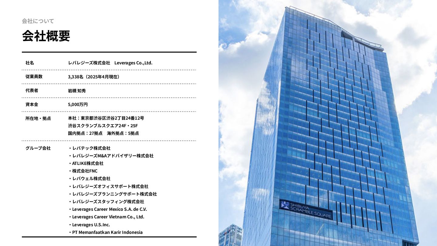 (最新の数値に更新する) デザイン調整する 社名 従業員数 代表者 資本⾦ 所在地‧拠点 グループ会社 レバレジーズ株式会社 Leverages Co.,Ltd. 3,338名(2025年4⽉現在) 岩槻 知秀 5,000万円 ‧レバテック株式会社 ‧レバレジーズM&Aアドバイザリー株式会社 ‧ATLIKE株式会社 ‧株式会社FNC ‧レバウェル株式会社 ‧レバレジーズオフィスサポート株式会社 ‧レバレジーズプランニングサポート株式会社 ‧レバレジーズスタッフィング株式会社 ‧Leverages Career Mexico S.A. de C.V. ‧Leverages Career Vietnam Co., Ltd. ‧Leverages U.S.Inc. ‧PT Memanfaatkan Karir Indonesia 本社:東京都渋⾕区渋⾕2丁⽬24番12号 渋⾕スクランブルスクエア24F‧25F 国内拠点:27拠点 海外拠点:5拠点 会社について