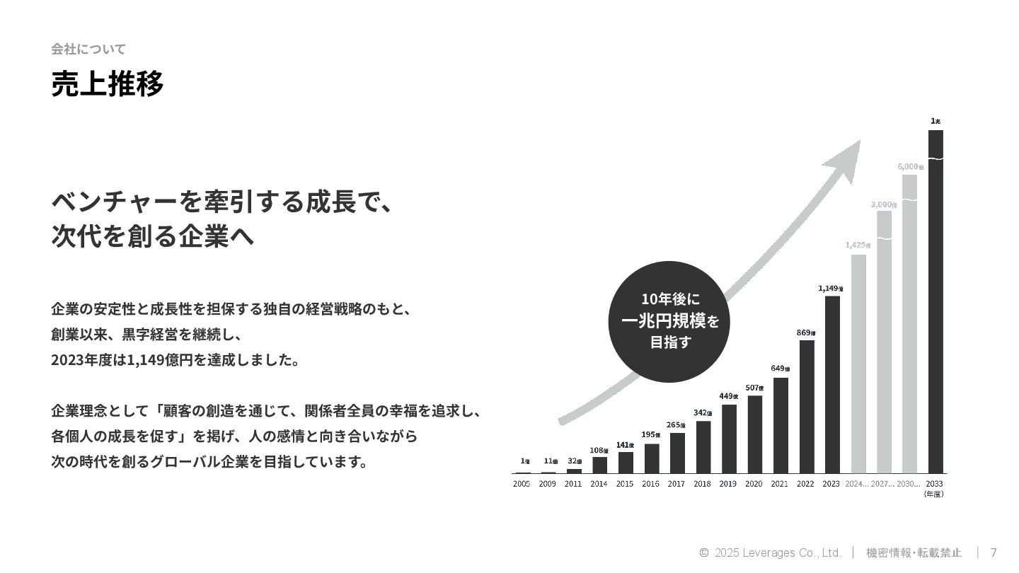 6 機密情報・転載禁止 © 2025 Leverages Co., Ltd. 会社概要 検討中 オフィス⽴地や社員数等最低限の情報