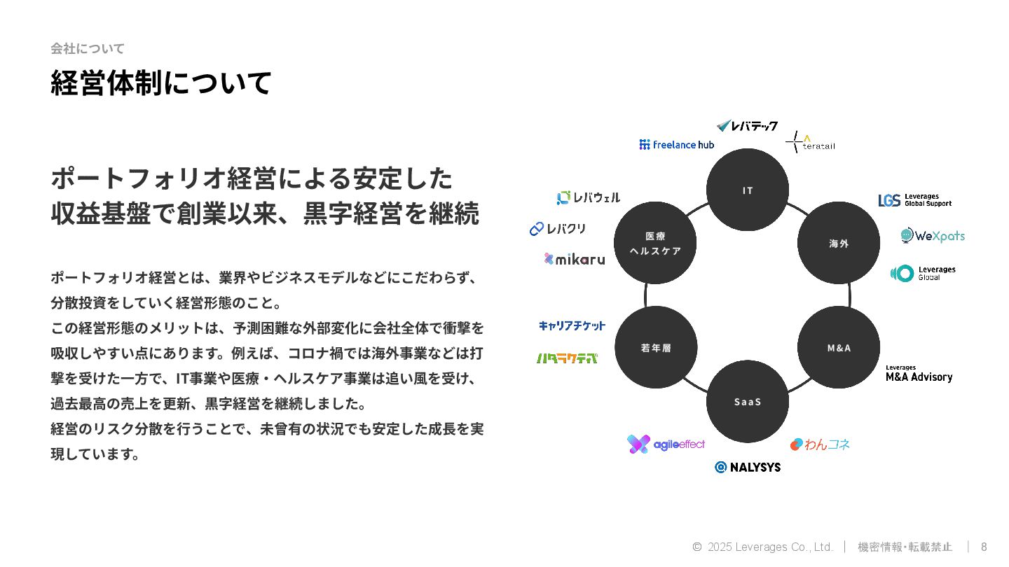 8 機密情報・転載禁止 © 2025 Leverages Co., Ltd. ポートフォリオ経営とは、業界やビジネスモデルなどにこだわらず、 分散投資をしていく経営形態のこと。 この経営形態のメリットは、予測困難な外部変化に会社全体で衝撃を