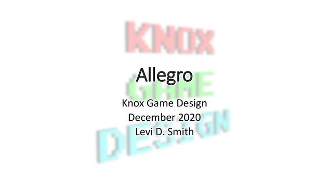 Start with al_install_joystick • Note - Allegro seems buggy about order of install calls. Be sure to call joystick install before audio install • Event based • al_register_event_source(eventqueue, al_get_joystick_event_source()) • Can have multiple joysticks • event.joystick.id == al_get_joystick(<int>) • Can have multiple sticks on a joystick • left = 0, right = 1, D-pad = 2 - event.joystick.stick == <int> • Determine axis with event.joystick.axis (x = 0, y = 1) • Axis value event.joystick.pos • Note - stick will probably generate multiple events per update, so you must handle all events, until al_get_next_event is NULL • Buttons - event.joystick.button == <int> • Polling based • al_get_joystick_state(<ALLEGRO_JOYSTICK *>, <ALLEGRO_JOYSTICK_STATE *>) • Seems more stable than event based, especially with two active axis • Downside is handling button up / button down • Can use mix of event based and polling based • Note - Should check if joystick exists before joystick handling code • Note - Be careful with mixing joystick polling with keyboard move events.