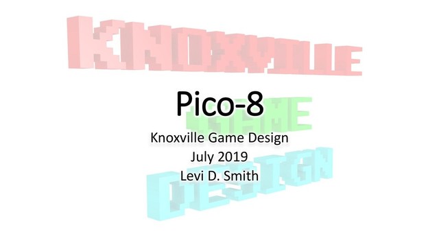 “carts” • https://www.lexaloffle.com/pico-8.php • Carts can be loaded to website • No lowercase characters, shift for special characters • Playable online or offline • $14.99 - Windows, Mac, Linux – Humble Store • LUA code • https://www.lua.org/manual/5.3/