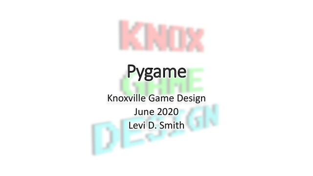 pygame with pygame.init() • Create loop that stops on pygame.QUIT • On each loop, process all events using pygame.event.get() • Recommend creating update and draw methods • Call pygame.display.update() to update the display • clock.tick(60) – set to run at 60 frames per second • Use pygame.quit() on exit