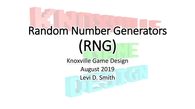 This month’s Knoxville Game Design topic is Random Number Generators (RNG). We will discuss the various methods for generating random values in game development. We will also look at combinatorics for determining the likelihood of outcomes.