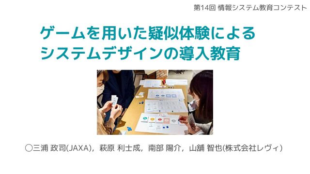 ゲームを用いた疑似体験による システムデザインの導入教育 第14回 情報システム教育コンテスト ◯三浦 政司(JAXA),萩原 利士成,南部 陽介,山舖 智也(株式会社レヴィ)