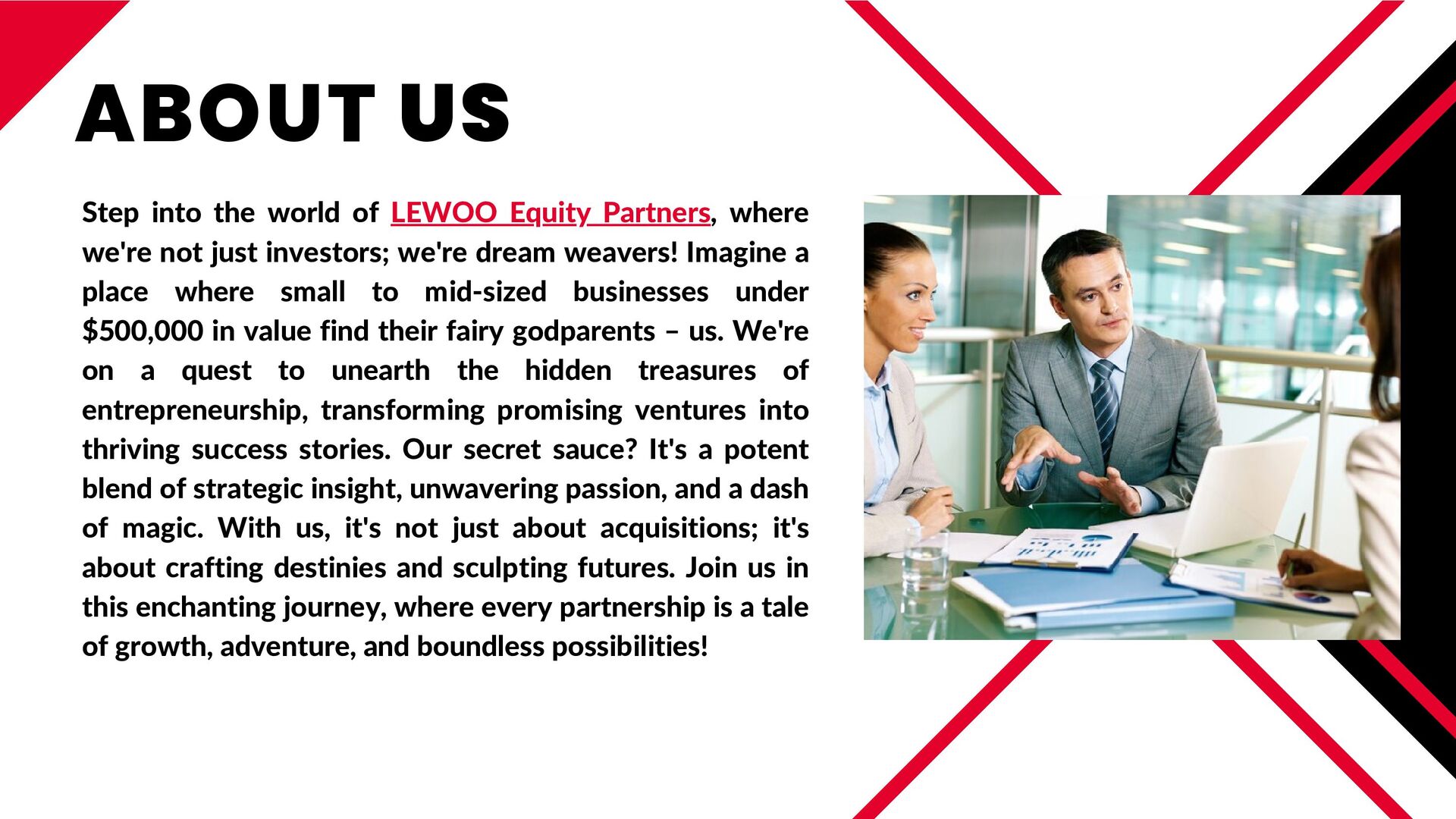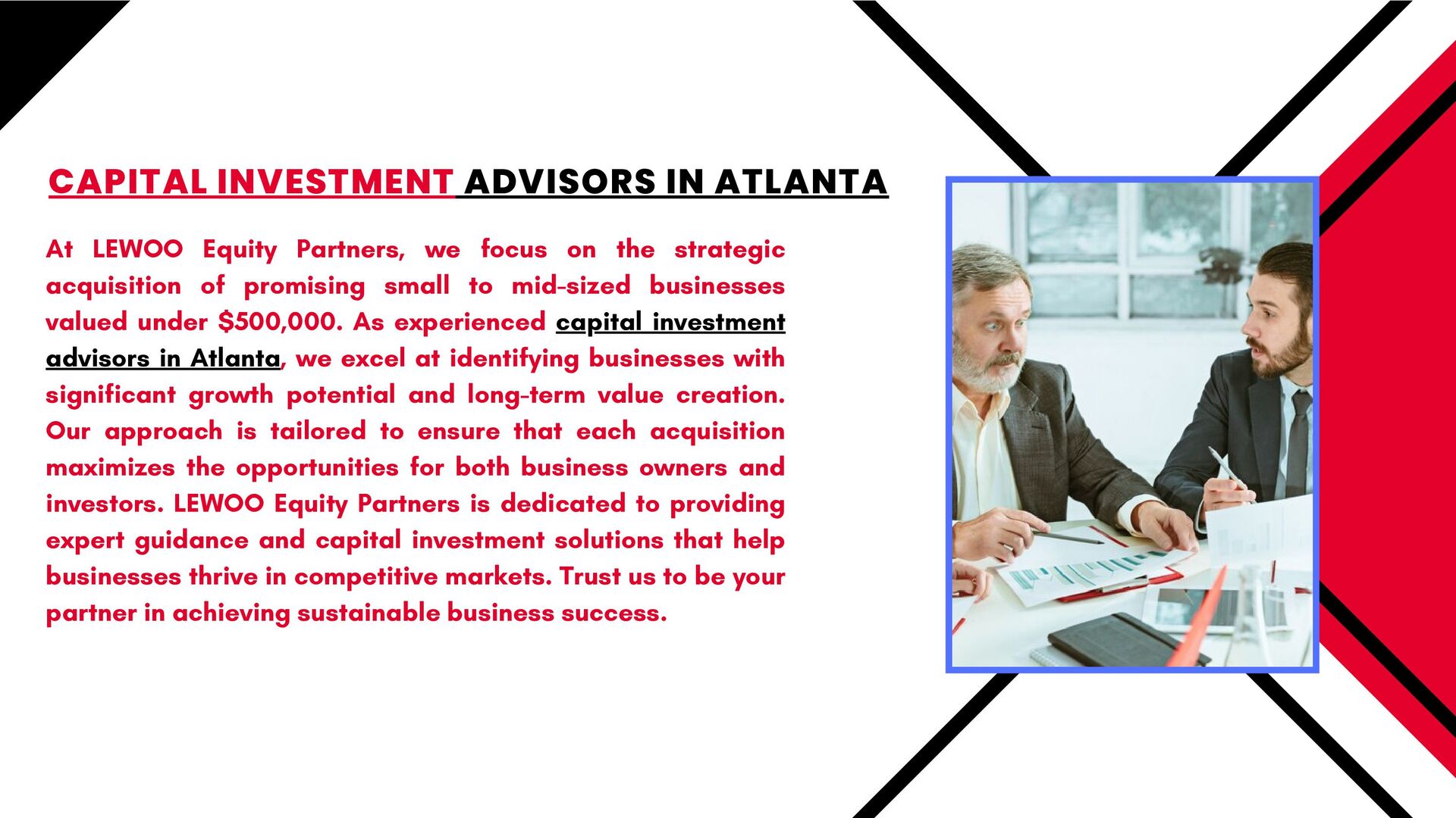 At LEWOO Equity Partners, we focus on the strategic acquisition of promising small to mid-sized businesses in Atlanta, particularly those valued under $500,000. Our expertise lies in identifying companies with significant growth potential and transforming them into valuable assets. By working with capital investment advisors in Atlanta, we ensure that each acquisition is aligned with long-term success and value creation. If you're seeking a partner who understands the intricacies of capital investment and business growth, LEWOO Equity Partners is your go-to resource for strategic business investments. To learn more visit at - https://below500k.com/top-strategies-for-attracting-venture-capital-for-startup-businesses/