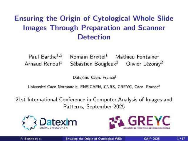 and Scanner Detection Paul Barthe1,2 Romain Brixtel1 Mathieu Fontaine1 Arnaud Renouf1 S´ ebastien Bougleux2 Olivier L´ ezoray2 Datexim, Caen, France1 Universit´ e Caen Normandie, ENSICAEN, CNRS, GREYC, Caen, France2 21st International Conference in Computer Analysis of Images and Patterns, September 2025 P. Barthe et al. Ensuring the Origin of Cytological WSIs CAIP 2025 1 / 17