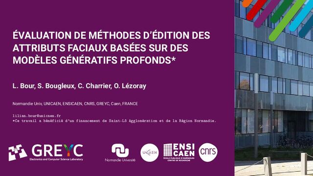 MODÈLES GÉNÉRATIFS PROFONDS* L. Bour, S. Bougleux, C. Charrier, O. Lézoray Normandie Univ, UNICAEN, ENSICAEN, CNRS, GREYC, Caen, FRANCE [email protected] *Ce travail a bénéficié d’un financement de Saint-Lô Agglomération et de la Région Normandie.