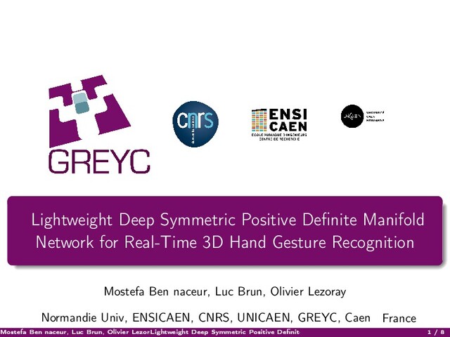 novel viewpoints. In Proceedings of the IEEE Conference on Computer Vision and Pattern Recognition (pp. 1506-1515). Zhu, W., Lan, C., Xing, J., Zeng, W., Li, Y., Shen, L., & Xie, X. (2016, March). Co-occurrence feature learning for skeleton based action recognition using regularized deep LSTM networks. In Proceedings of the AAAI Conference on Artificial Intelligence (Vol. 30, No. 1). Zhang, X., Wang, Y., Gou, M., Sznaier, M., & Camps, O. (2016). Efficient temporal sequence comparison and classification using gram matrix embeddings on a riemannian manifold. In Proceedings of the IEEE conference on computer vision and pattern recognition (pp. 4498-4507). Garcia-Hernando, G., & Kim, T. K. (2017). Transition forests: Learning discriminative temporal transitions for action recognition and detection. In Proceedings of the IEEE Conference on Computer Vision and Pattern Recognition (pp. 432-440). Huang, Z., & Van Gool, L. (2017, February). A riemannian network for spd matrix learning. In Proceedings of the AAAI Conference on Artificial Intelligence (Vol. 31, No. 1). Mostefa Ben naceur, Luc Brun, Olivier Lezoray () Lightweight Deep Symmetric Positive Definite Manifold Network for Real-Time 3D Hand G 8 / 8