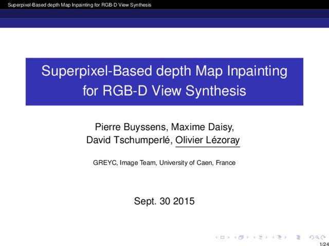 Source planes search Key ideas : • Use the original depth map Jo to infer good depth values of the missing pixels, • Use the previous superpixels matching for more robustness. How to find the good superpixel(s) ? Proposed method : Given a pixel p to inpaint 1 Find the closest known pixel q1 ∈ Js (belonging to the superpixel Rs 1 ), and the one q2 on the opposite side of the hole (belonging to the superpixel Rs 2 ), 2 Get the offsets ∆p 1 = p −q1 and ∆p 2 = p −q2 , 3 Report q1 and q2 on Jo by inverse warping (constraint : warped pixels belong to Ro 1 and Ro 2 respectively), 4 From these two points, get the superpixel(s) pointed by −∆p 1 and −∆p 2 respectively. Js Jo Js Jo 13/24