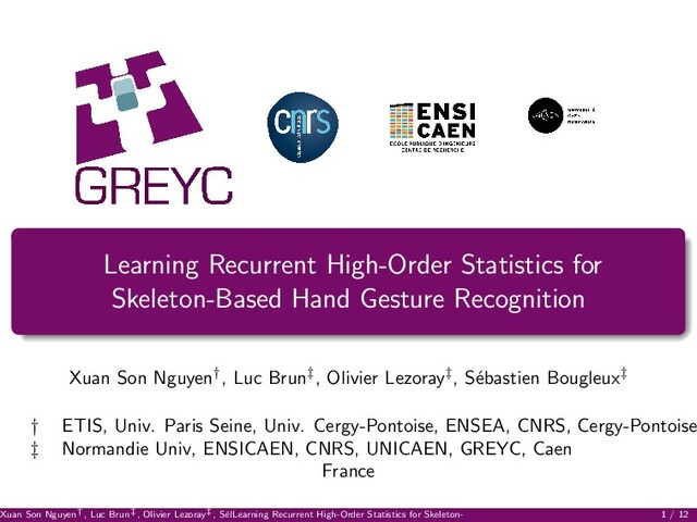 Archer, D., Vaillancourt, D. E., Singh, V., and Vemuri, B. C. (2018). A Statistical Recurrent Model on the Manifold of Symmetric Positive Definite Matrices. In NeurIPS, pages 8897–8908. Devanne, M., Wannous, H., Berretti, S., Pala, P., Daoudi, M., and Bimbo, A. D. (2015). 3-D Human Action Recognition by Shape Analysis of Motion Trajectories on Riemannian Manifold. IEEE Transactions on Cybernetics, 45(7):1340–1352. Devineau, G., Moutarde, F., Xi, W., and Yang, J. (2018). Deep Learning for Hand Gesture Recognition on Skeletal Data. In IEEE International Conference on Automatic Face Gesture Recognition, pages 106–113. Du, Y., Wang, W., and Wang, L. (2015). Hierarchical Recurrent Neural Network for Skeleton Based Action Recognition. In CVPR, pages 1110–1118. Garcia-Hernando, G. and Kim, T.-K. (2017). Transition Forests: Learning Discriminative Temporal Transitions for Action Recognition. In CVPR, pages 407–415. Xuan Son Nguyen†, Luc Brun‡, Olivier Lezoray‡, S´ ebastien Bougleux‡ () Learning Recurrent High-Order Statistics for Skeleton-Based Hand Gesture Recognition 9 / 12