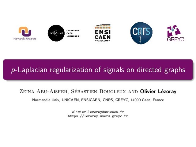 (vi ) = 1 2 d∗ w ∇w f(vi ) p−2 2 (dw f )(vi , vj ) = 1 2 d∗ w (dw f )(vi , vj ) ∇w f(vi ) 2−p 2 Putting all the ingredients in a general directed p-Laplacian formulation ∆p,∗ w f (vi ) = 1 2 f (vi ) vj →vi w(vj , vi )2 φ(vj , vi ) ∇w f(vj ) 2−p 2 + vi →vj w(vi , vj )2 φ(vi , vj ) ∇w f(vi ) 2−p 2 − vj →vi w(vj , vi )2 γ1 (vj , vi ) ∇w f(vj ) 2−p 2 f (vj ) + vi →vj w(vi , vj )2 γ2 (vi , vj ) ∇w f(vi ) 2−p 2 f (vj ) where φ, γ1 and γ2 are defined as follows, depending on the chosen directed p-Laplacian ∆p,∗ w : ∆p w : φ(vi , vj ) = φ(vj , vi ) = γ1 (vj , vi ) = γ2 (vi , vj ) = 1, ˜ ∆p w : φ(vi , vj ) = d− (vj ) d+ (vi ), φ(vj , vi ) = d− (vi ) d+ (vj ), γ1 (vj , vi ) = d− (vi ) and γ2 (vi , vj ) = d+ (vi ), ∆p,rw w : φ(vi , vj ) = d+ (vj ), φ(vj , vi ) = d+ (vj ) and γ1 (vj , vi ) = γ2 (vi , vj ) = d+ (vi ). 15 / 32