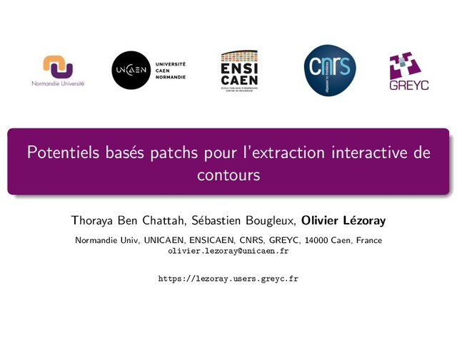 Un pixel est consid´ er´ e comme sur un contour si le patch ` a sa gauche est di↵´ erent de celui ` a sa droite. dc dc dl dr P 1 (p) = max ✓ d✓, 1 c (p) PAF 2 (p) = max ✓ AF(d✓, 1 s (p)) AF 2 {min, max, mean} d ✓, 1 s = { d ✓, 1 l , d ✓, 1 c , d ✓, 1 r } avec comme di↵´ erences entre patchs : centr´ ee sur p: d✓, c (p) = d P(pl ,✓, ), P(pr ,✓, ) upwind gauche: d✓, l (p) = d P(p), P(pl ,✓, ) upwind droite: d✓, r (p) = d P(p), P(pr ,✓, ) avec d(P(p i ), P(p j )) = kP(p i ) P(p j )k 2 et ✓ 2 {0 , 45 , 90 , 135 } et la distance entre les pixels le long de la ligne. 15 / 30
