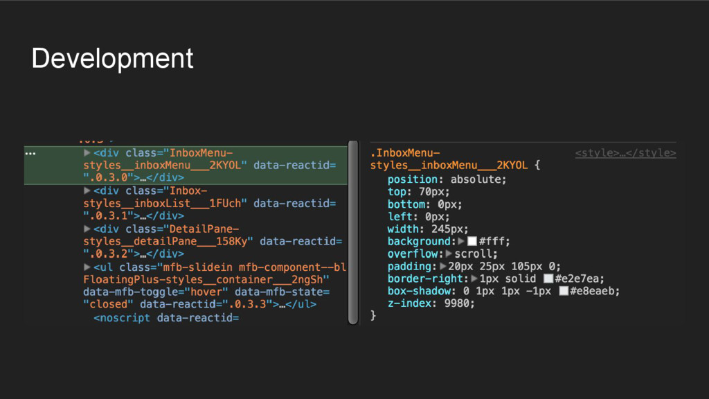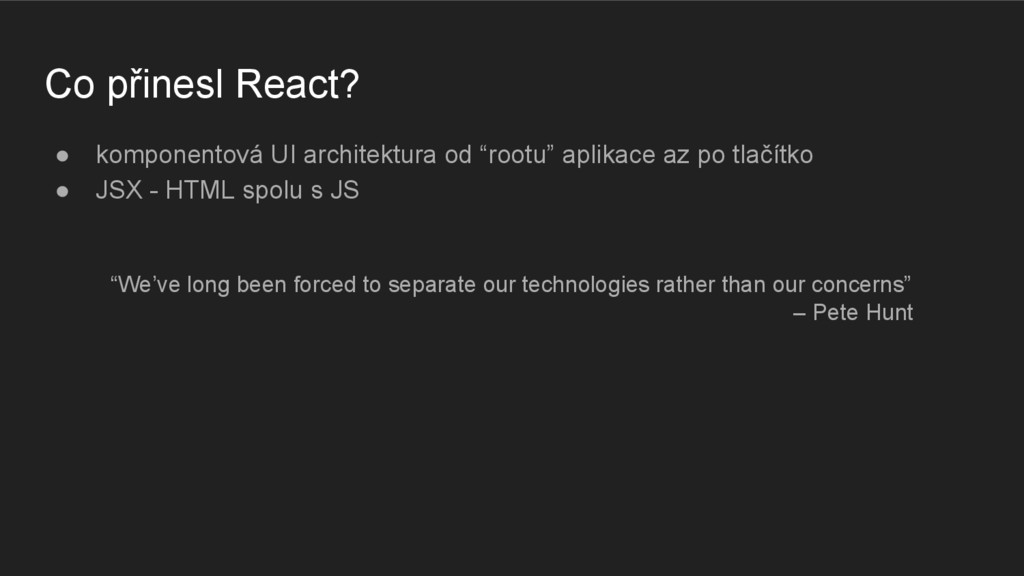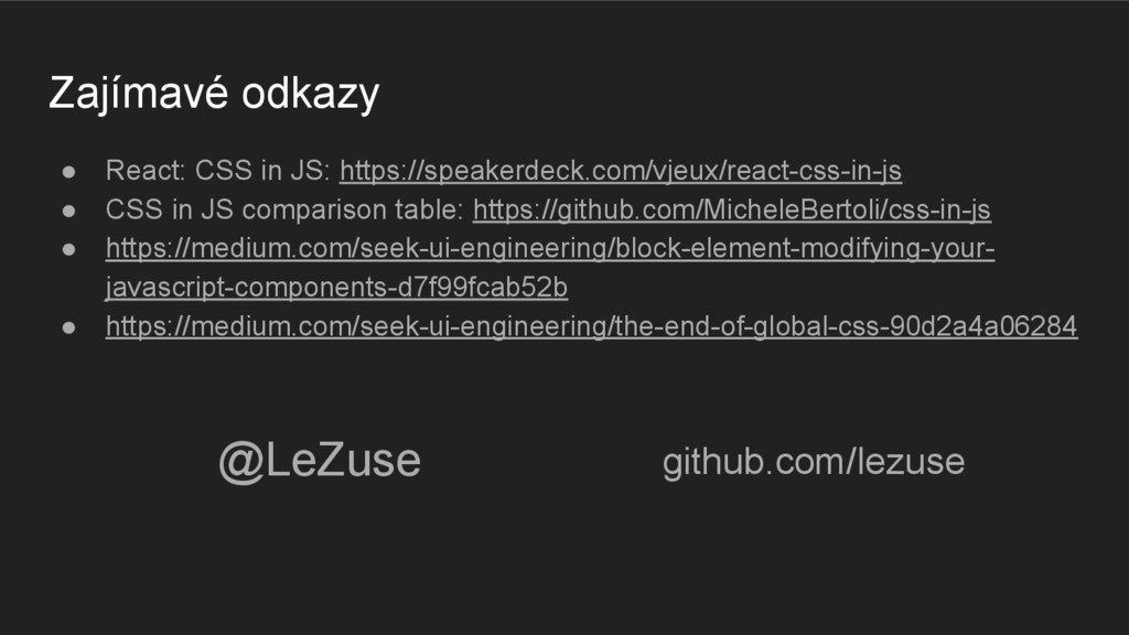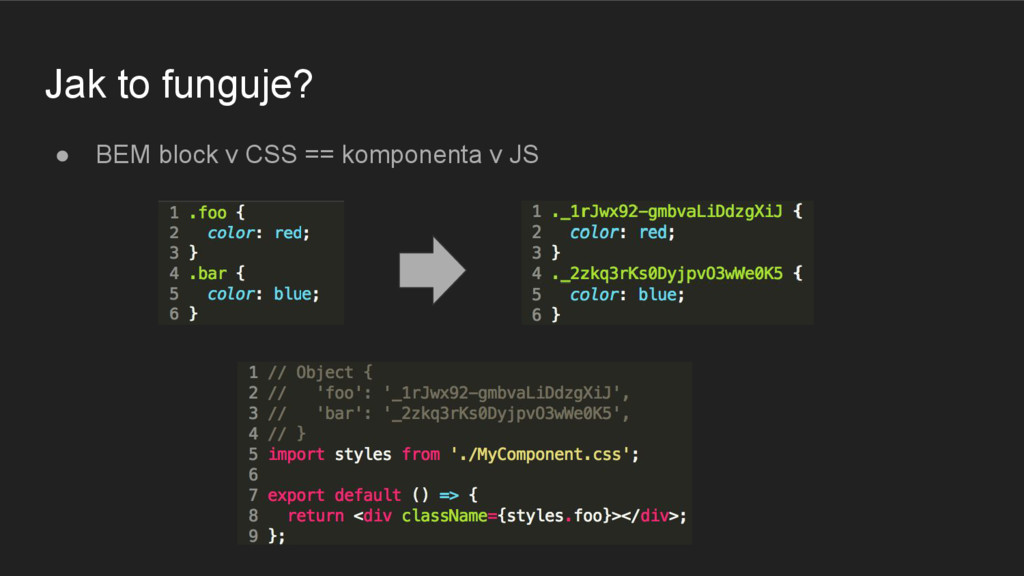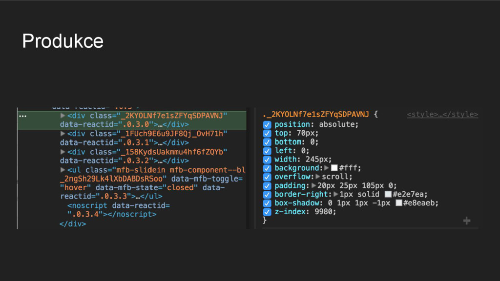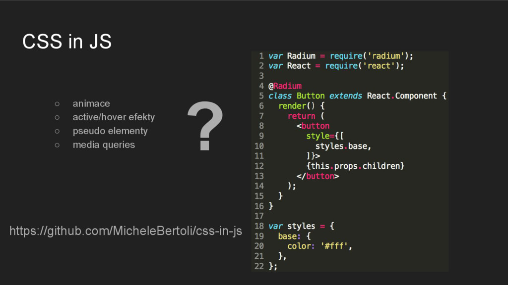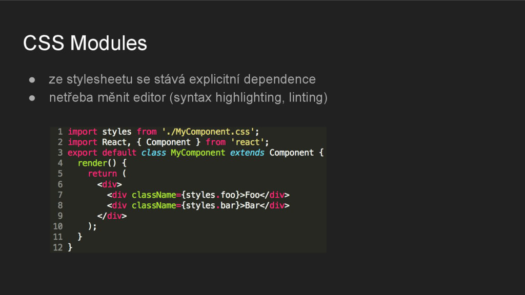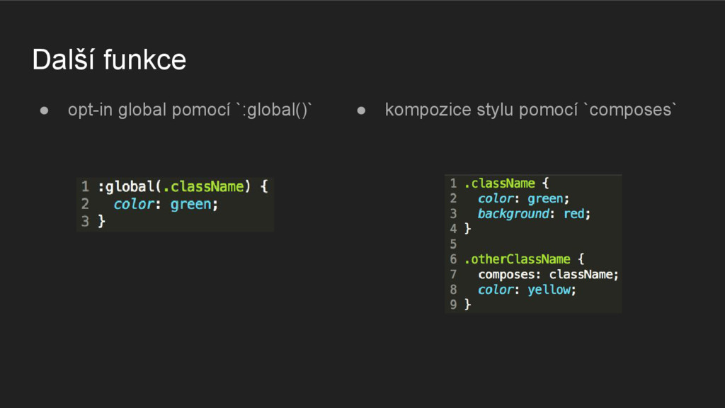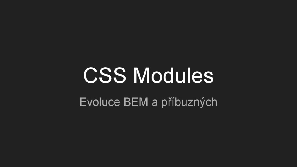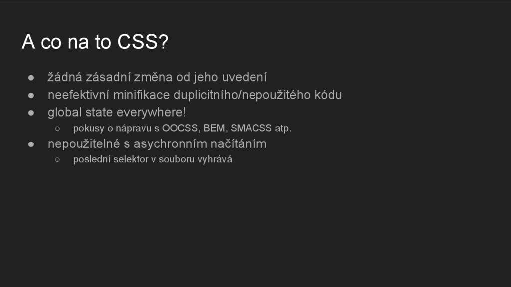 jeho uvedení • neefektivní minifikace duplicitního/nepoužitého kódu • global state everywhere! ◦ pokusy o nápravu s OOCSS, BEM, SMACSS atp. • nepoužitelné s asychronním načítáním ◦ poslední selektor v souboru vyhrává