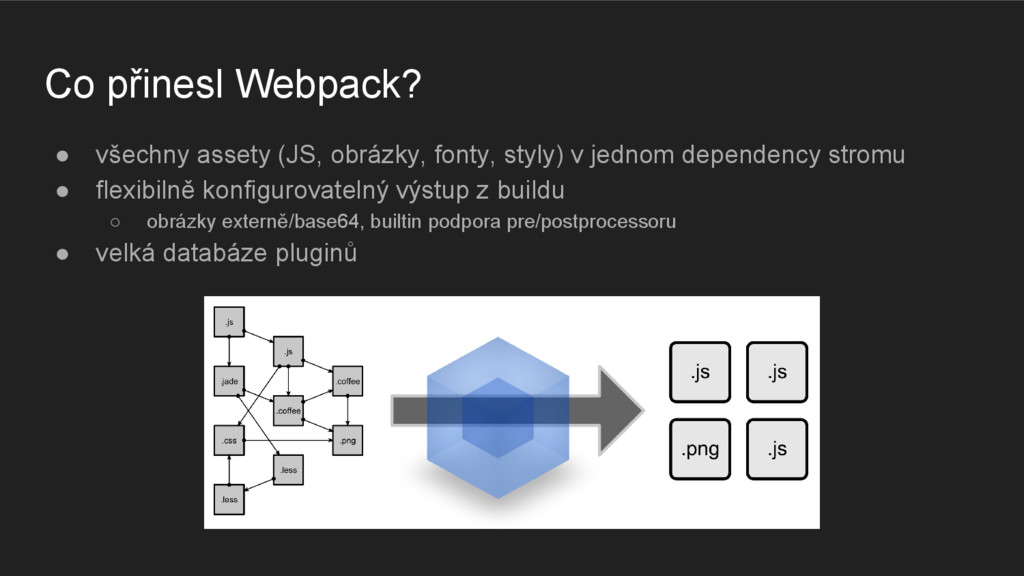 v jednom dependency stromu • flexibilně konfigurovatelný výstup z buildu ◦ obrázky externě/base64, builtin podpora pre/postprocessoru • velká databáze pluginů
