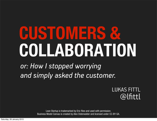 LUKAS FITTL @lfittl CUSTOMERS & COLLABORATION Lean Startup is trademarked by Eric Ries and used with permission. Business Model Canvas is created by Alex Osterwalder and licensed under CC-BY-SA. Saturday, 26 January 2013