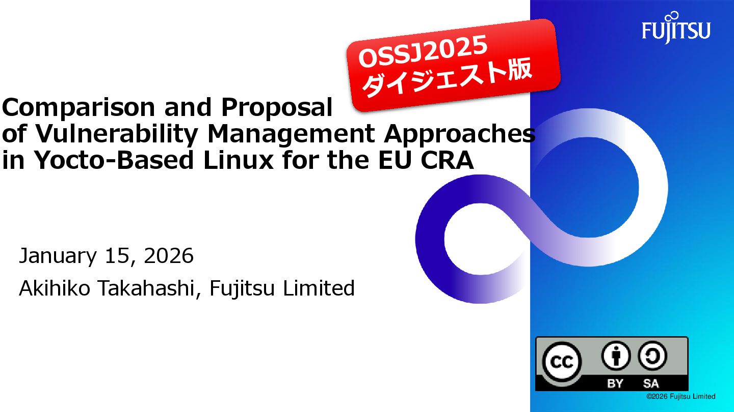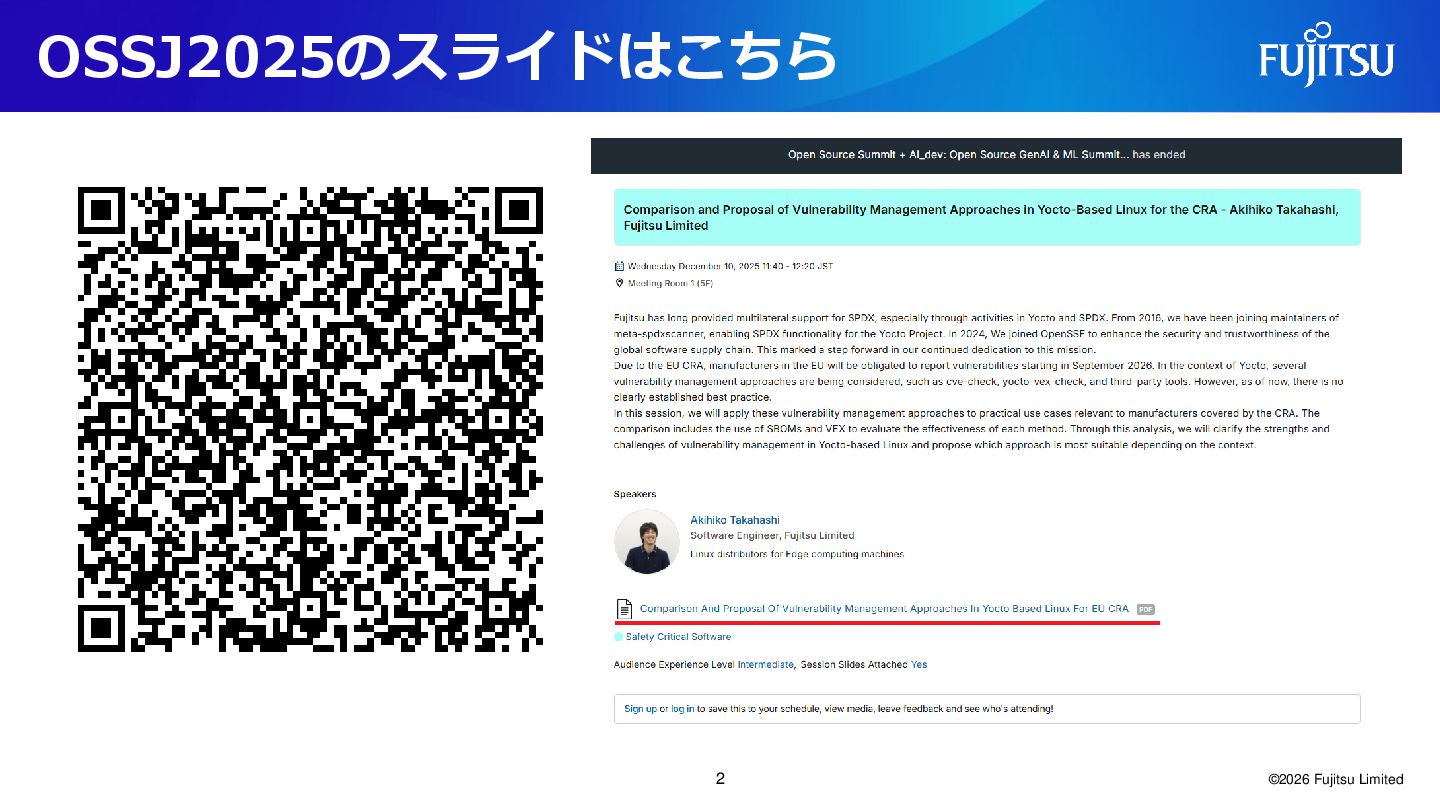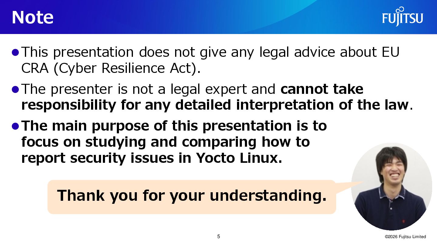 to EU CRA (Cyber Resilience Act) who are currently using Yocto Project. ⚫ (Rationale: This presentation aims to provide information that can assist them in considering their compliance requirements.) ⚫Secondary Target Audiences ⚫Manufacturers not subject to the CRA but using Yocto Project. ⚫ (Rationale: Vulnerability management principles often overlap, and this presentation may offer insightful information for them.) ⚫Anyone interested in the topic of embedded Linux security. ⚫ (Rationale: We aim to provide valuable information for a broad audience interested in this topic.) ©2026 Fujitsu Limited 4