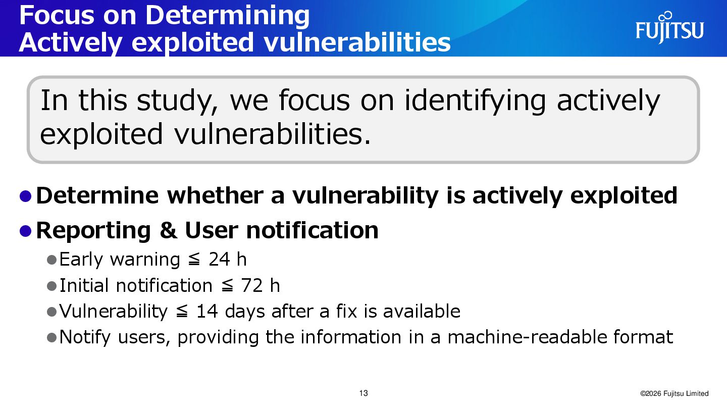 is actively exploited ⚫Reporting & User notification ⚫Early warning ≦ 24 h ⚫Initial notification ≦ 72 h ⚫Vulnerability ≦ 14 days after a fix is available ⚫Notify users, providing the information in a machine-readable format ©2026 Fujitsu Limited In this study, we focus on identifying actively exploited vulnerabilities. 13