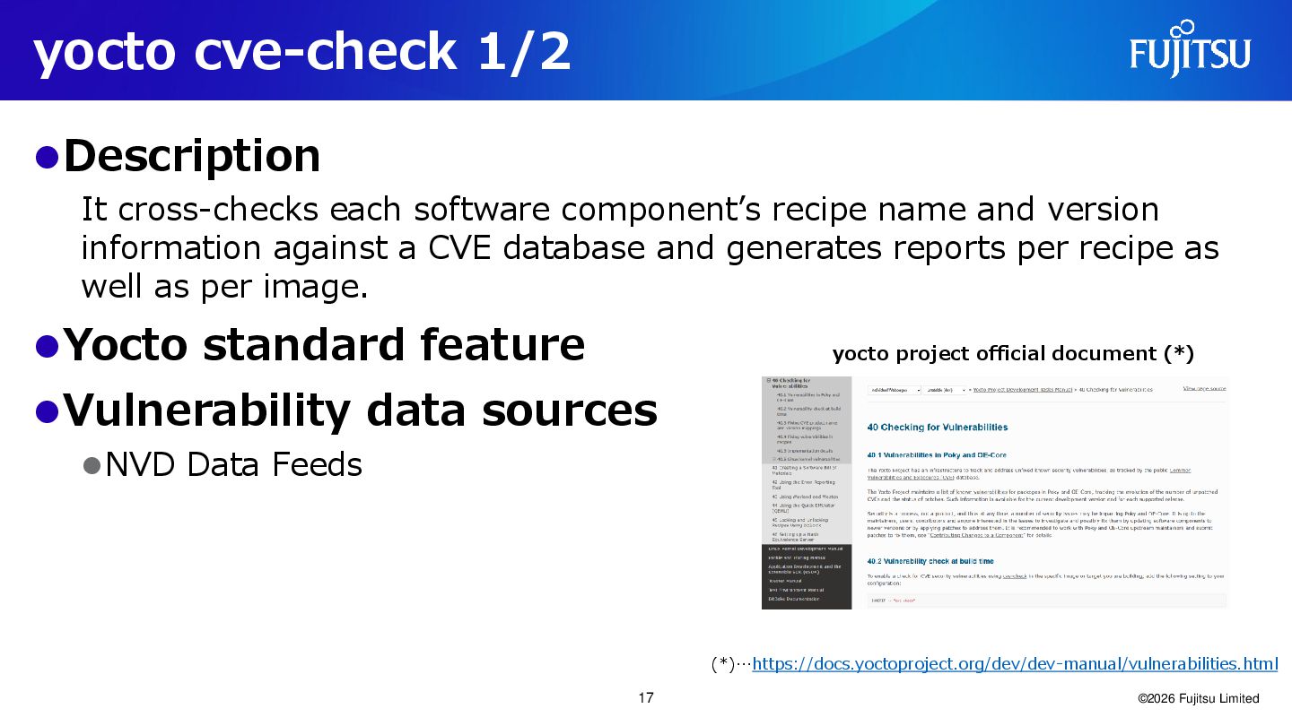 (Investigating) ©2026 Fujitsu Limited (*)… https://github.com/bootlin/sbom-cve-check 16