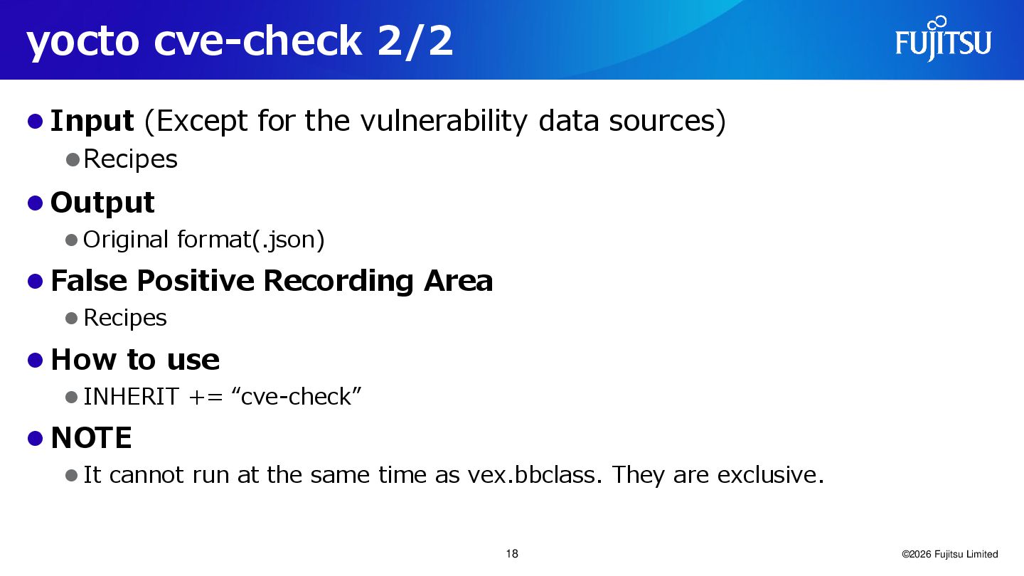 sources) ⚫Recipes ⚫ Output ⚫ Original format(.json) ⚫ False Positive Recording Area ⚫ Recipes ⚫ How to use ⚫ INHERIT += “cve-check” ⚫ NOTE ⚫ It cannot run at the same time as vex.bbclass. They are exclusive. ©2026 Fujitsu Limited 18