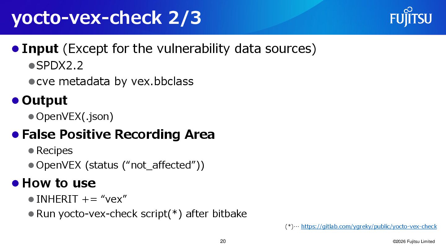⚫SPDX2.2 ⚫cve metadata by vex.bbclass ⚫ Output ⚫ OpenVEX(.json) ⚫ False Positive Recording Area ⚫ Recipes ⚫ OpenVEX (status (“not_affected”)) ⚫ How to use ⚫ INHERIT += “vex” ⚫ Run yocto-vex-check script(*) after bitbake ©2026 Fujitsu Limited (*)… https://gitlab.com/ygreky/public/yocto-vex-check 20