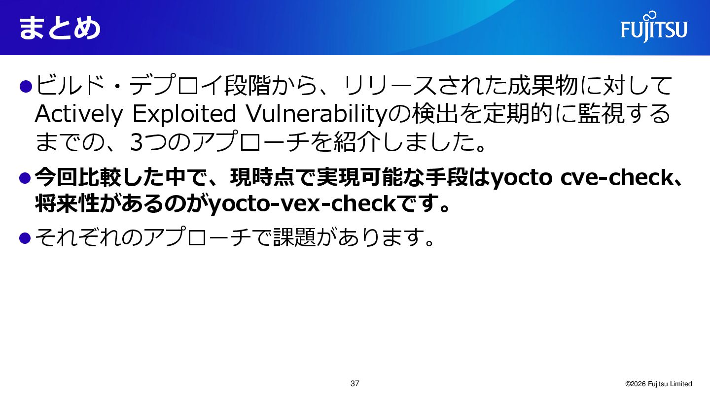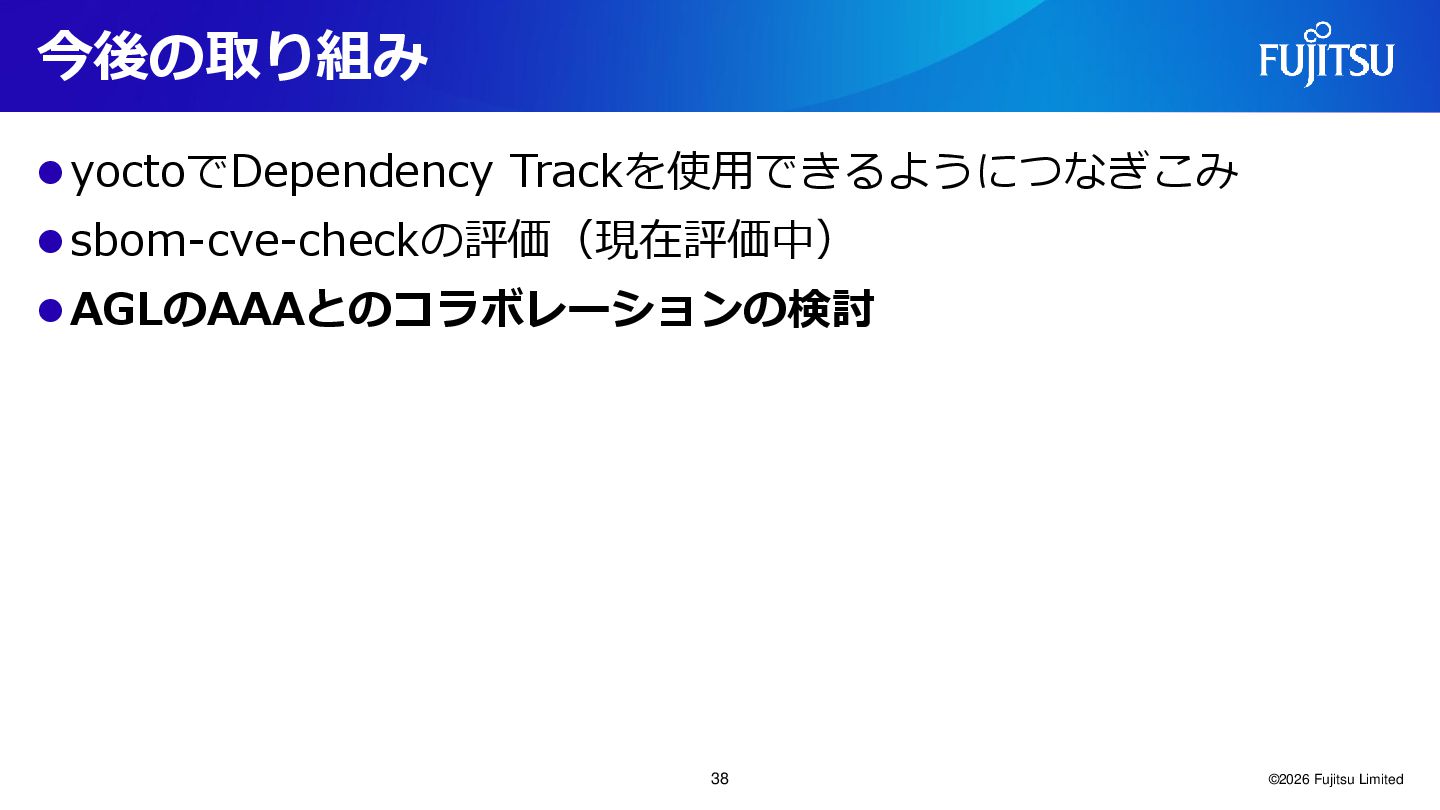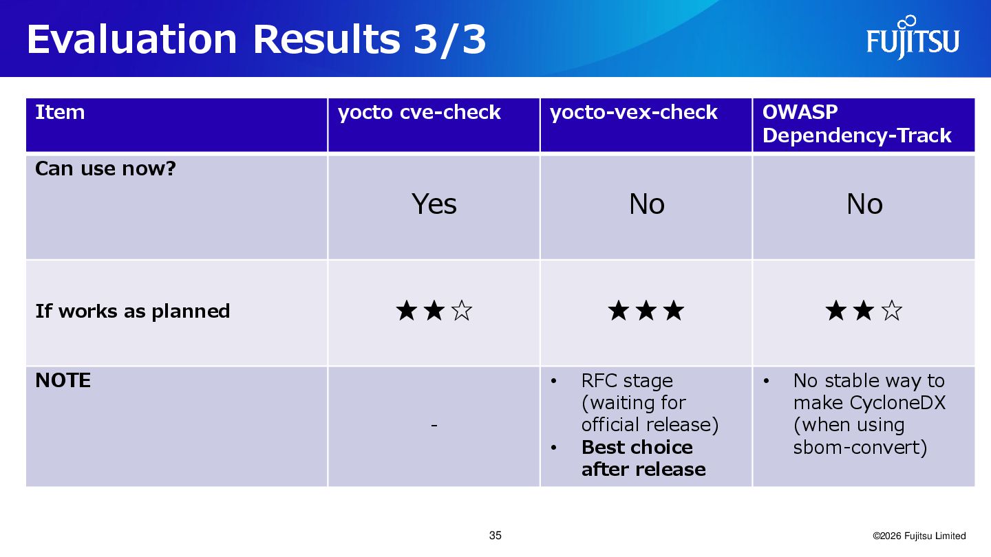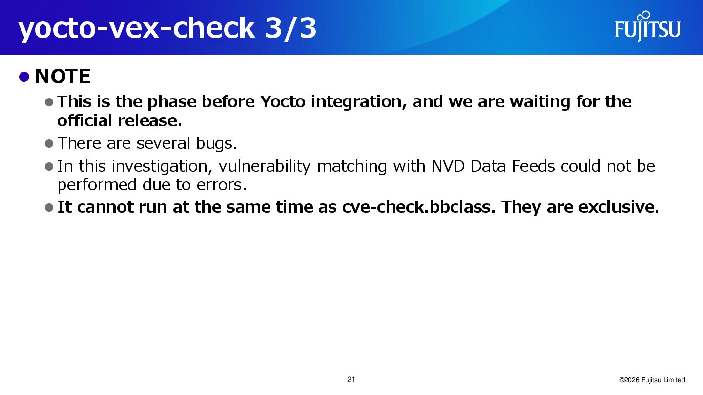 Yocto integration, and we are waiting for the official release. ⚫ There are several bugs. ⚫ In this investigation, vulnerability matching with NVD Data Feeds could not be performed due to errors. ⚫ It cannot run at the same time as cve-check.bbclass. They are exclusive. ©2026 Fujitsu Limited 21