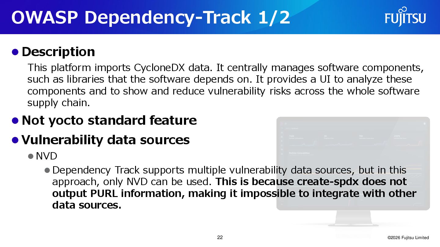It centrally manages software components, such as libraries that the software depends on. It provides a UI to analyze these components and to show and reduce vulnerability risks across the whole software supply chain. ⚫ Not yocto standard feature ⚫ Vulnerability data sources ⚫ NVD ⚫ Dependency Track supports multiple vulnerability data sources, but in this approach, only NVD can be used. This is because create-spdx does not output PURL information, making it impossible to integrate with other data sources. ©2026 Fujitsu Limited 22