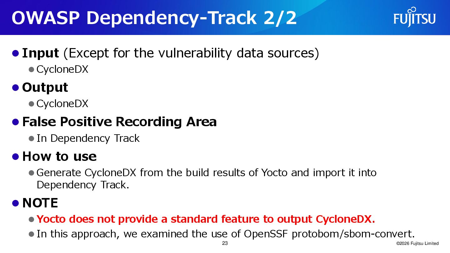 sources) ⚫ CycloneDX ⚫ Output ⚫ CycloneDX ⚫ False Positive Recording Area ⚫ In Dependency Track ⚫ How to use ⚫ Generate CycloneDX from the build results of Yocto and import it into Dependency Track. ⚫ NOTE ⚫ Yocto does not provide a standard feature to output CycloneDX. ⚫ In this approach, we examined the use of OpenSSF protobom/sbom-convert. ©2026 Fujitsu Limited 23