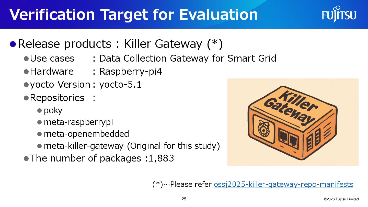 ⚫Use cases : Data Collection Gateway for Smart Grid ⚫Hardware : Raspberry-pi4 ⚫yocto Version : yocto-5.1 ⚫Repositories : ⚫ poky ⚫ meta-raspberrypi ⚫ meta-openembedded ⚫ meta-killer-gateway (Original for this study) ⚫The number of packages :1,883 ©2026 Fujitsu Limited (*)…Please refer ossj2025-killer-gateway-repo-manifests 25
