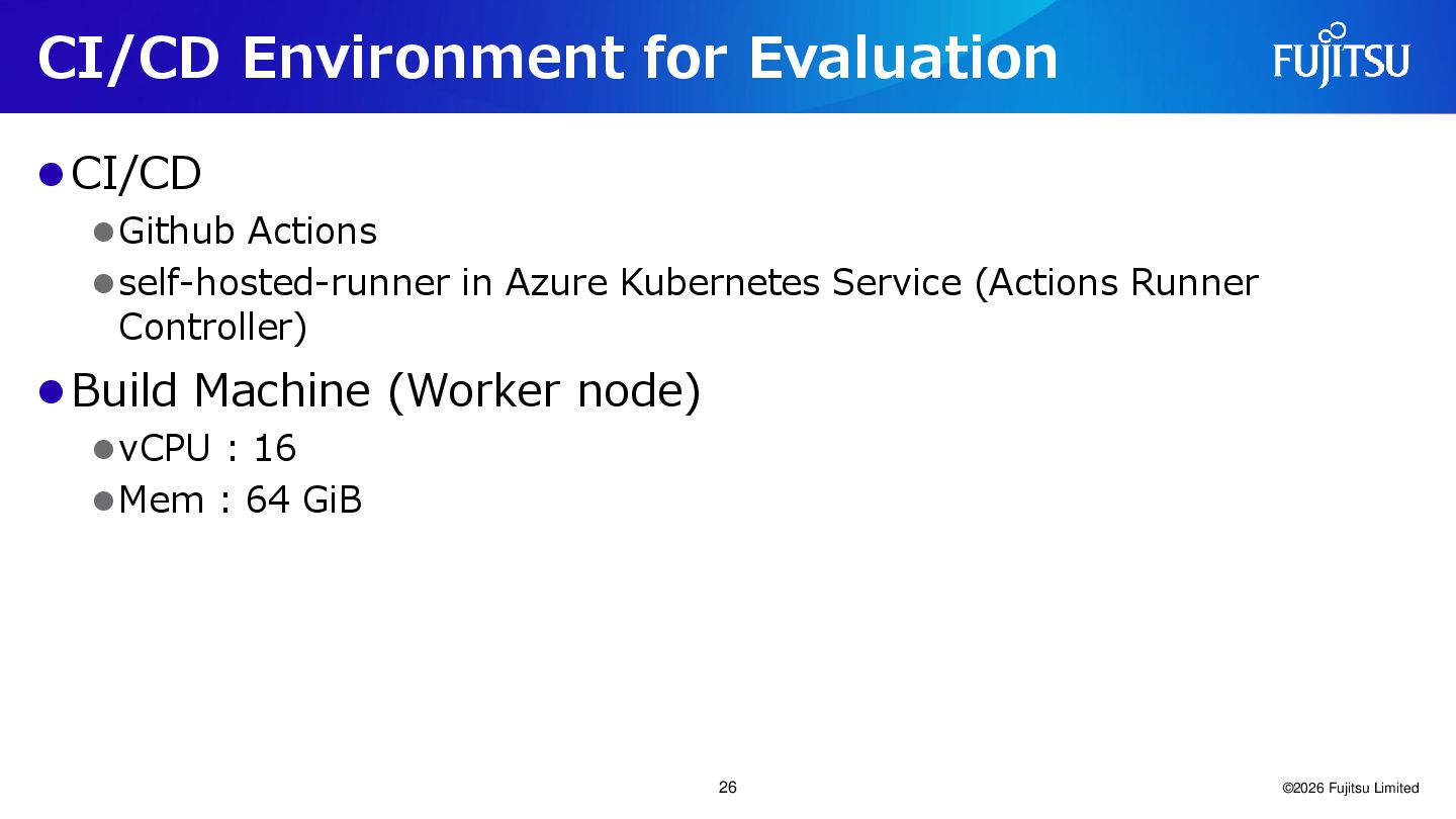 Kubernetes Service (Actions Runner Controller) ⚫Build Machine (Worker node) ⚫vCPU : 16 ⚫Mem : 64 GiB ©2026 Fujitsu Limited 26
