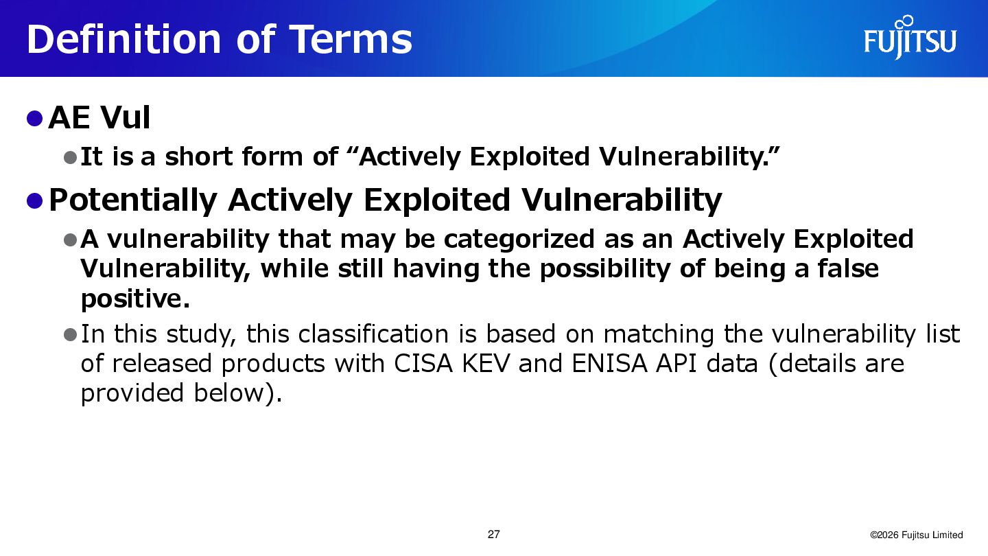 of “Actively Exploited Vulnerability.” ⚫Potentially Actively Exploited Vulnerability ⚫A vulnerability that may be categorized as an Actively Exploited Vulnerability, while still having the possibility of being a false positive. ⚫In this study, this classification is based on matching the vulnerability list of released products with CISA KEV and ENISA API data (details are provided below). ©2026 Fujitsu Limited 27