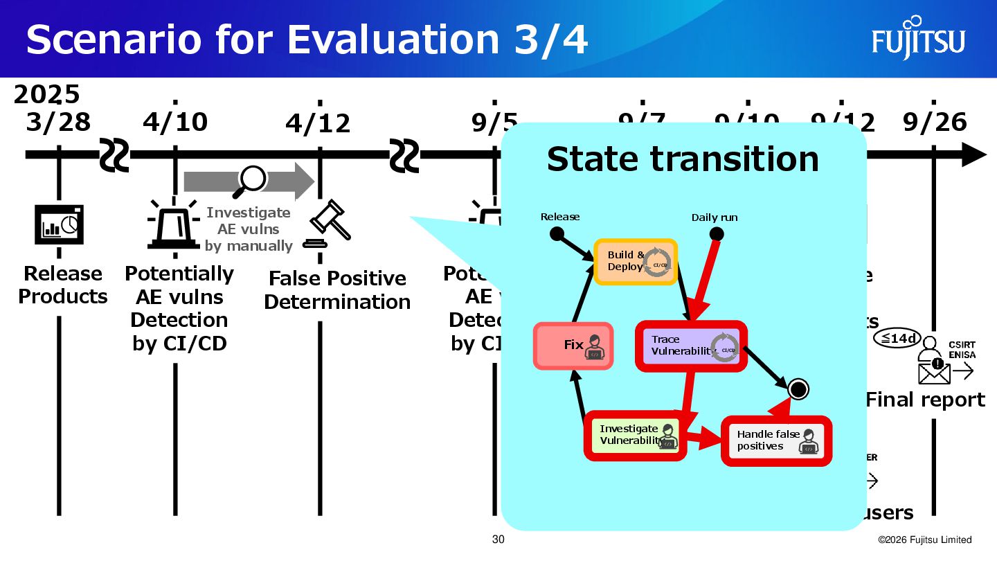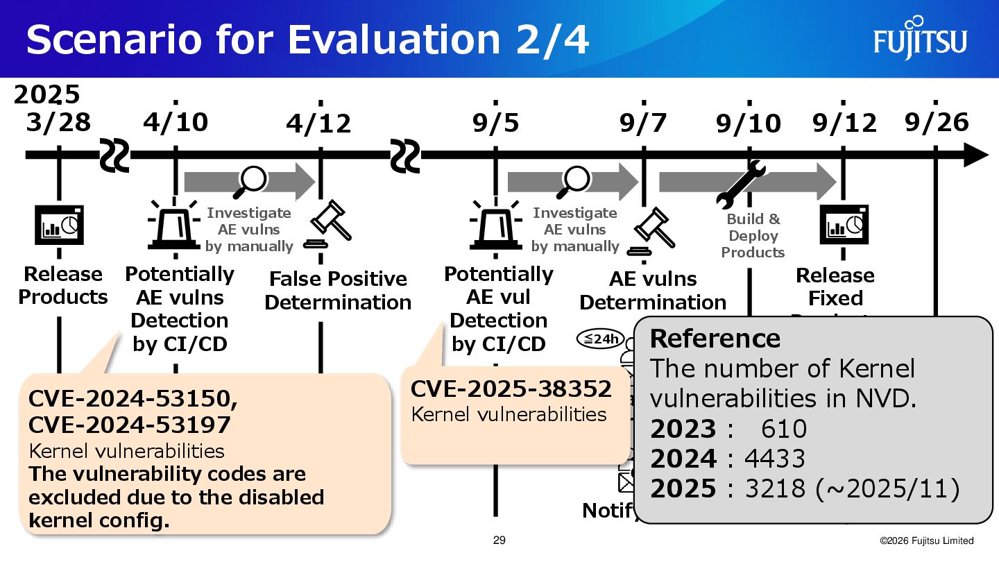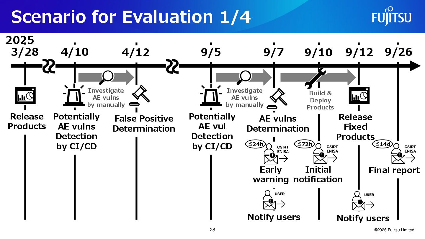 Products 4/10 4/12 9/5 9/7 Release Products Investigate AE vulns by manually False Positive Determination AE vulns Determination Initial notification Final report 9/10 Build & Deploy Products 9/12 9/26 ~ ~ ~ ~ Early warning Investigate AE vulns by manually 2025 Notify users Notify users Potentially AE vulns Detection by CI/CD Potentially AE vul Detection by CI/CD Handle false positives Release Daily run Build & Deploy CI/CD Fix Investigate Vulnerability Trace Vulnerability CI/CD State transition ≦14d 30