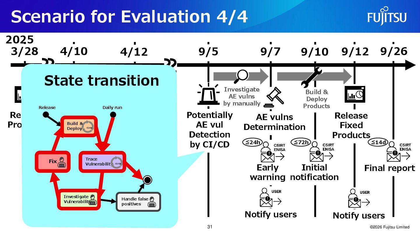 Products 4/10 4/12 9/5 9/7 Release Products Investigate AE vulns by manually False Positive Determination AE vulns Determination Initial notification Final report 9/10 Build & Deploy Products 9/12 9/26 ~ ~ ~ ~ Early warning Investigate AE vulns by manually 2025 Notify users Notify users Potentially AE vulns Detection by CI/CD Potentially AE vul Detection by CI/CD Handle false positives Release Daily run Build & Deploy CI/CD Fix Investigate Vulnerability Trace Vulnerability CI/CD State transition ≦24h ≦72h ≦14d 31