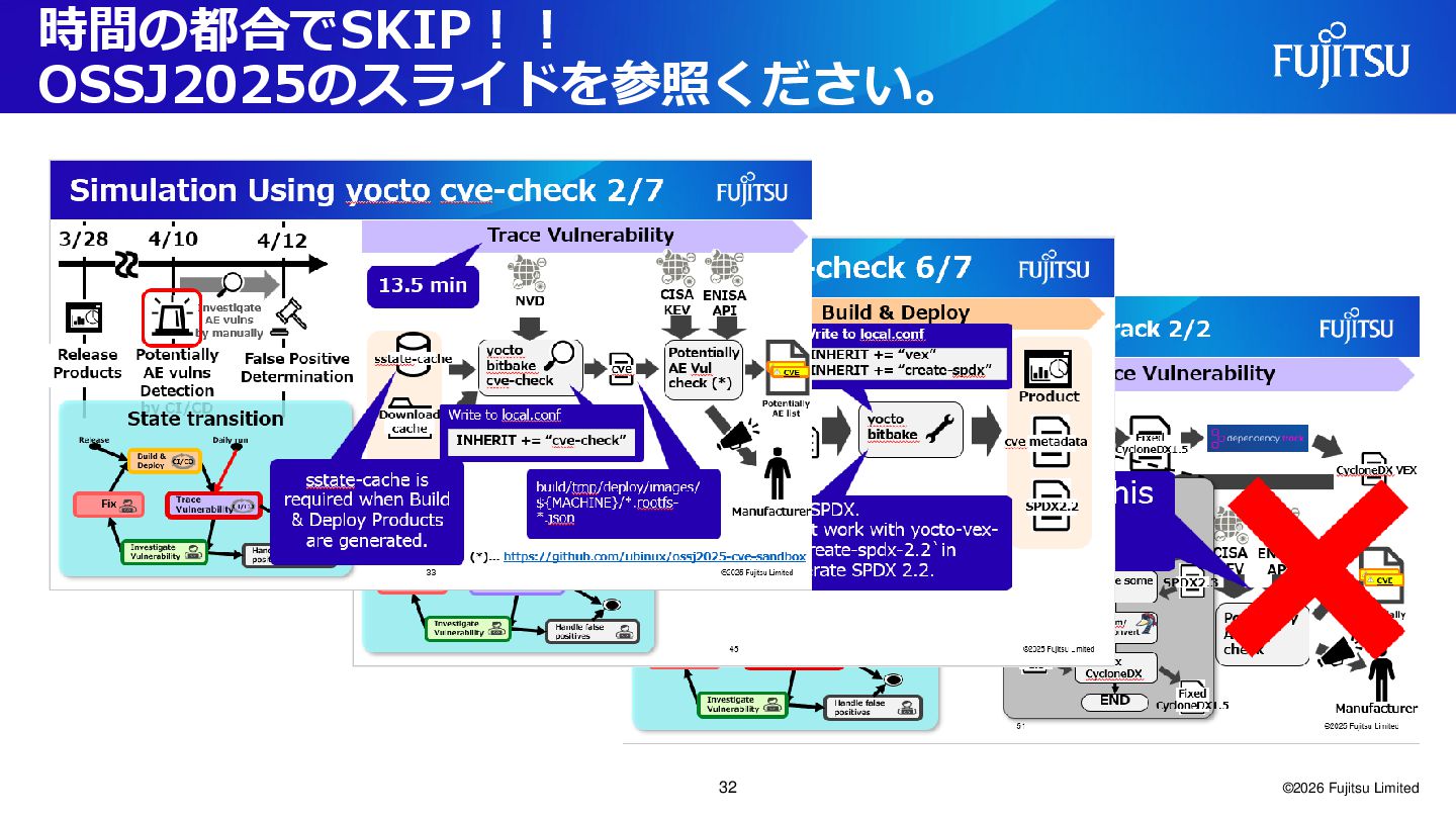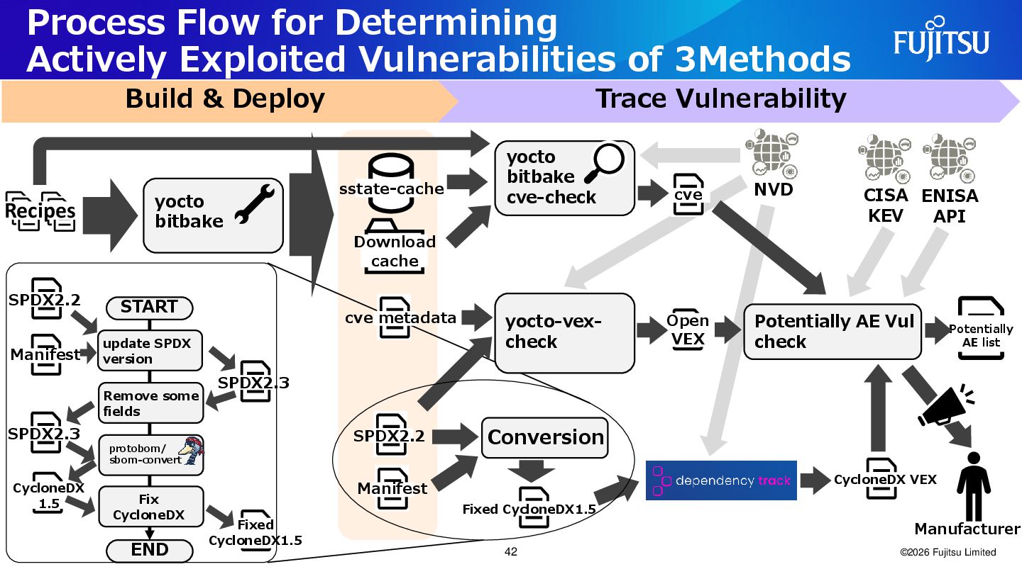 Fujitsu Limited Trace Vulnerability Build & Deploy yocto bitbake SPDX2.2 NVD cve metadata sstate-cache Manifest yocto bitbake cve-check yocto-vex- check Conversion Recipes Fixed CycloneDX1.5 Potentially AE Vul check Potentially AE list cve Open VEX CycloneDX VEX protobom/ sbom-convert SPDX2.2 Manifest update SPDX version SPDX2.3 Download cache Remove some fields Fix CycloneDX CycloneDX 1.5 SPDX2.3 Fixed CycloneDX1.5 START END Manufacturer CISA KEV ENISA API 42
