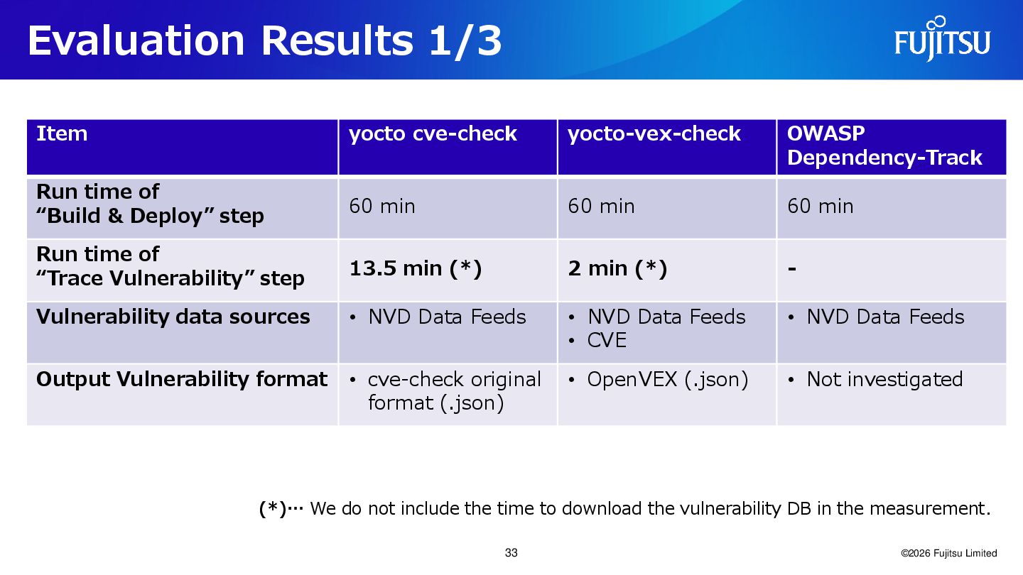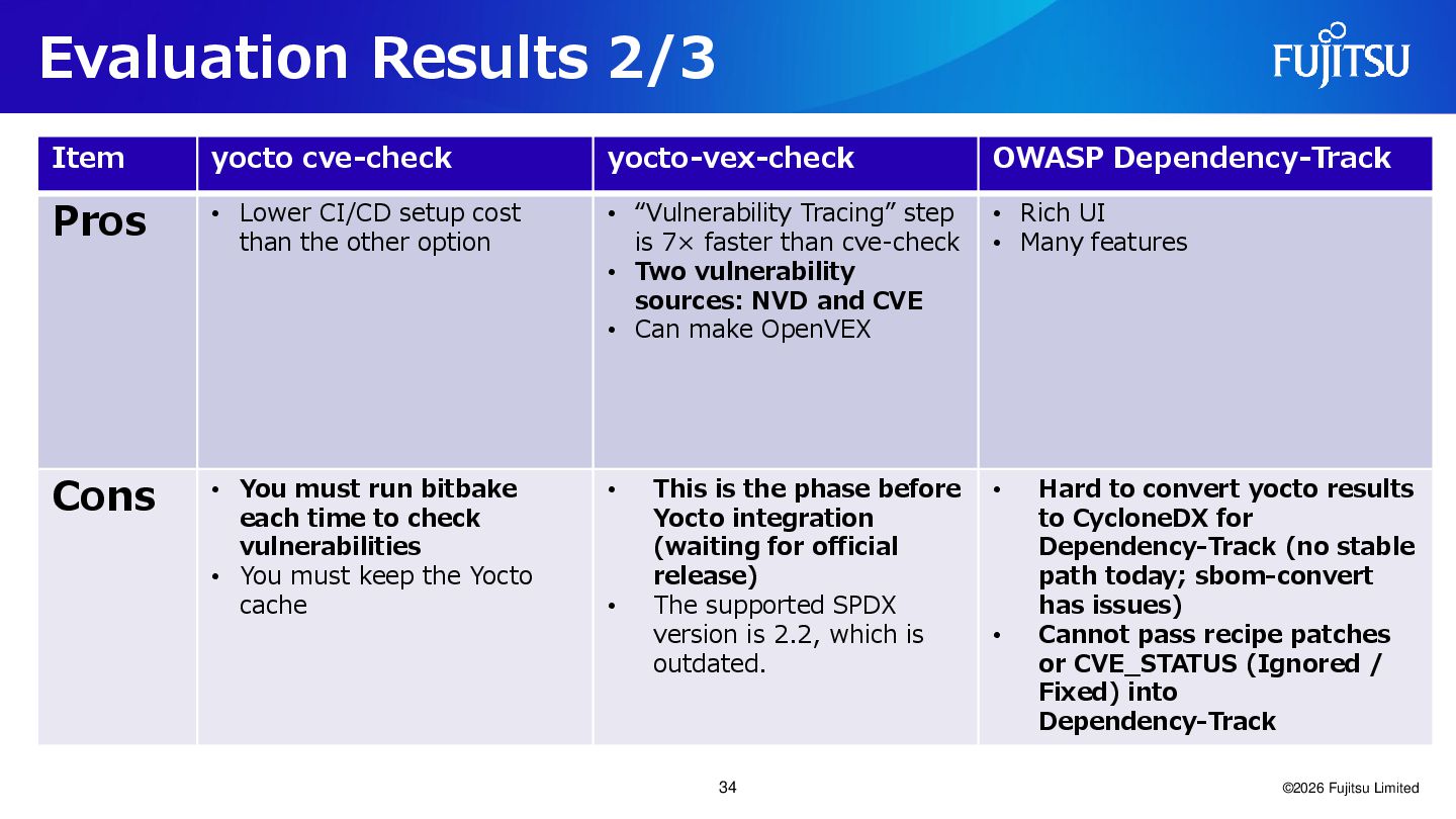 27. Evaluation Results 1/3 ©2026 Fujitsu Limited Item yocto cve-check yocto-vex-check
