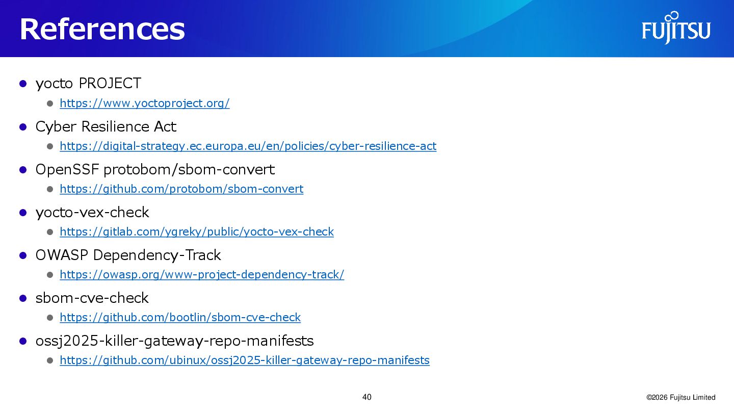 ⚫ https://digital-strategy.ec.europa.eu/en/policies/cyber-resilience-act ⚫ OpenSSF protobom/sbom-convert ⚫ https://github.com/protobom/sbom-convert ⚫ yocto-vex-check ⚫ https://gitlab.com/ygreky/public/yocto-vex-check ⚫ OWASP Dependency-Track ⚫ https://owasp.org/www-project-dependency-track/ ⚫ sbom-cve-check ⚫ https://github.com/bootlin/sbom-cve-check ⚫ ossj2025-killer-gateway-repo-manifests ⚫ https://github.com/ubinux/ossj2025-killer-gateway-repo-manifests ©2026 Fujitsu Limited 40