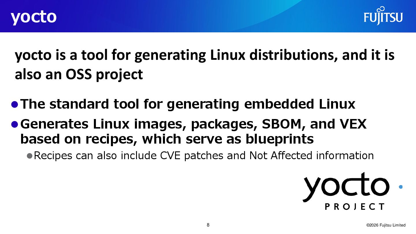 images, packages, SBOM, and VEX based on recipes, which serve as blueprints ⚫Recipes can also include CVE patches and Not Affected information ©2026 Fujitsu Limited yocto is a tool for generating Linux distributions, and it is also an OSS project 8
