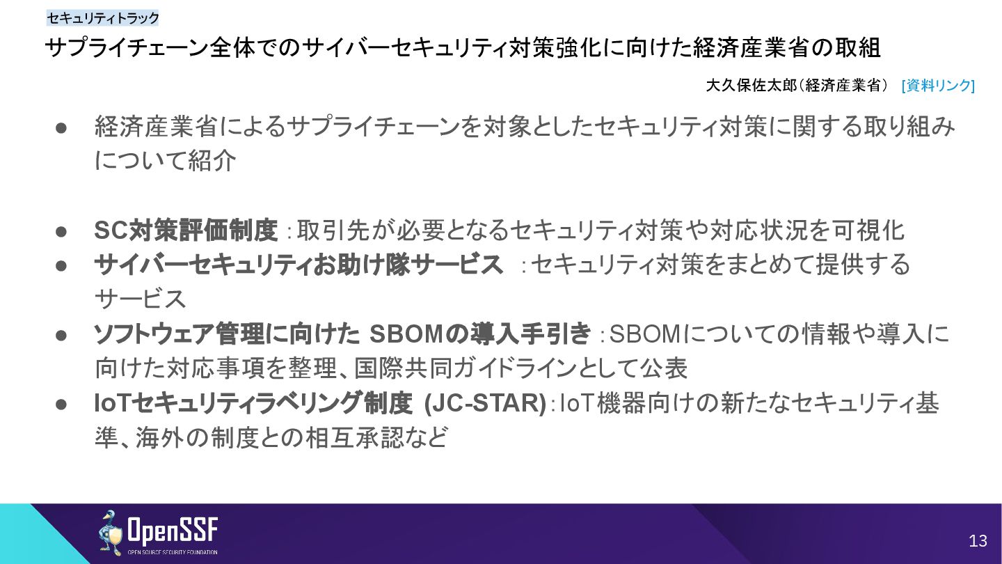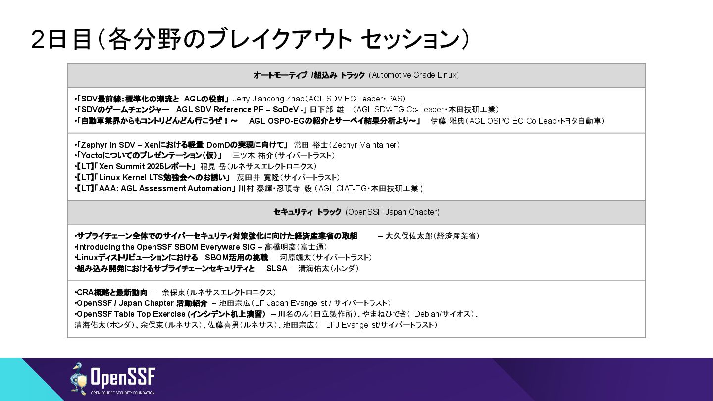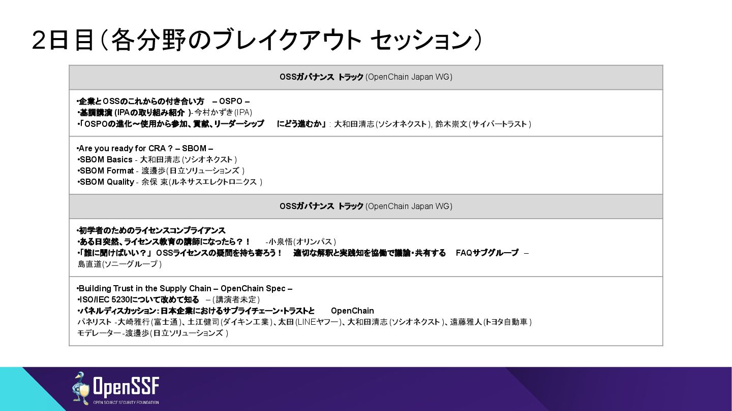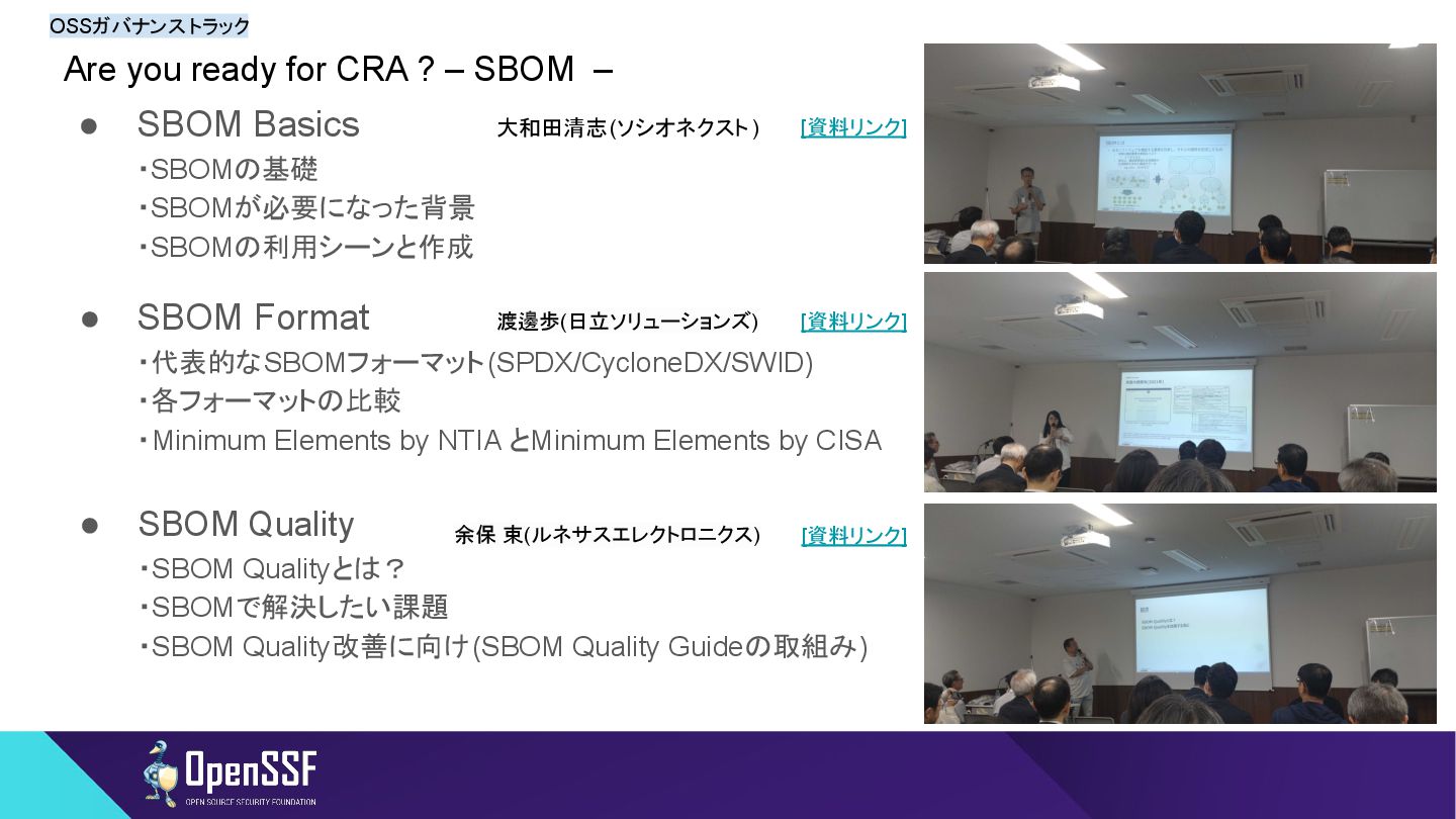 • SBOM Format ・代表的なSBOMフォーマット(SPDX/CycloneDX/SWID) ・各フォーマットの比較 ・Minimum Elements by NTIA とMinimum Elements by CISA • SBOM Basics ・SBOMの基礎 ・SBOMが必要になった背景 ・SBOMの利用シーンと作成 Are you ready for CRA ? – SBOM – 大和田清志(ソシオネクスト) [資料リンク] OSSガバナンス トラック 渡邊歩(日立ソリューションズ) [資料リンク] 余保 束(ルネサスエレクトロニクス) [資料リンク]