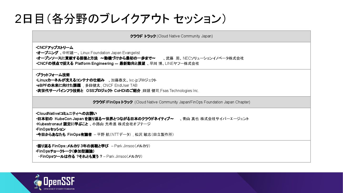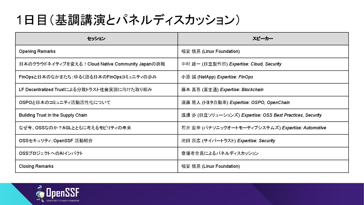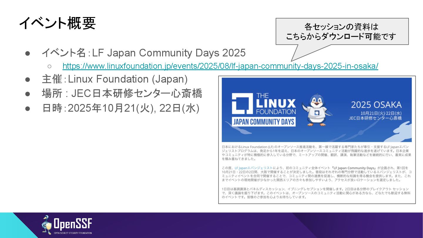 • SBOM Format ・代表的なSBOMフォーマット(SPDX/CycloneDX/SWID) ・各フォーマットの比較 ・Minimum Elements by NTIA とMinimum Elements by CISA • SBOM Basics ・SBOMの基礎 ・SBOMが必要になった背景 ・SBOMの利用シーンと作成 Are you ready for CRA ? – SBOM – 大和田清志(ソシオネクスト) [資料リンク] OSSガバナンス トラック 渡邊歩(日立ソリューションズ) [資料リンク] 余保 束(ルネサスエレクトロニクス) [資料リンク]