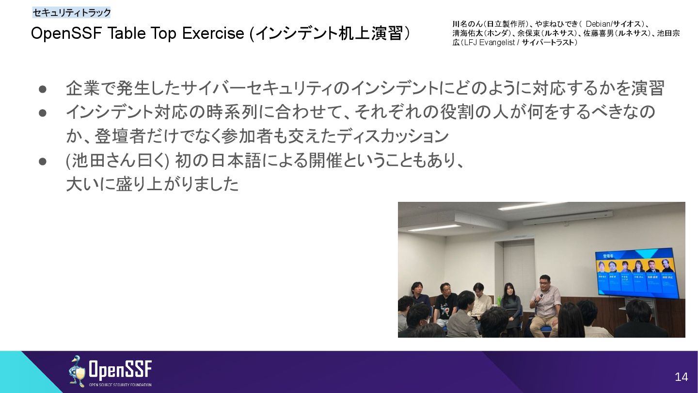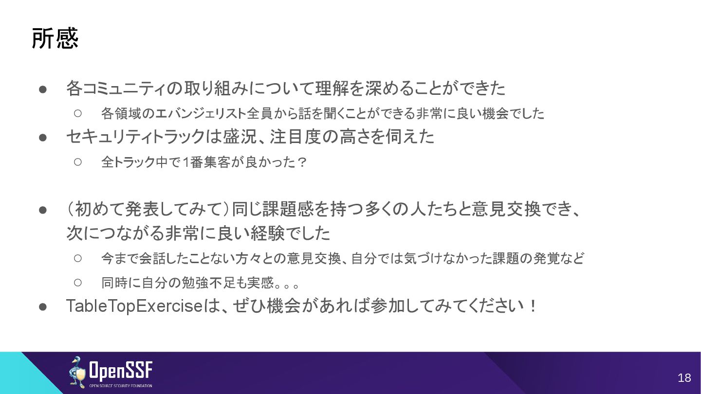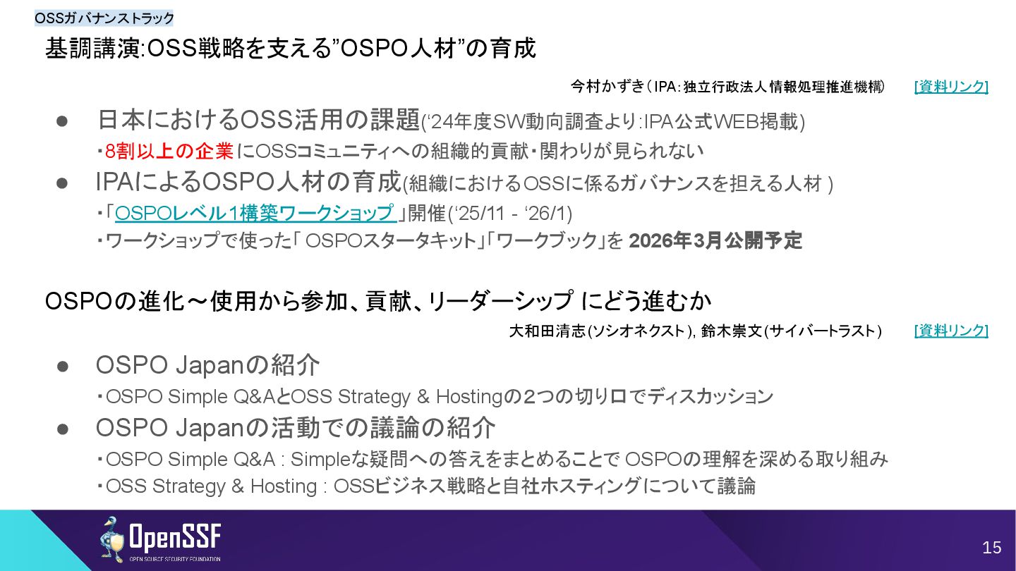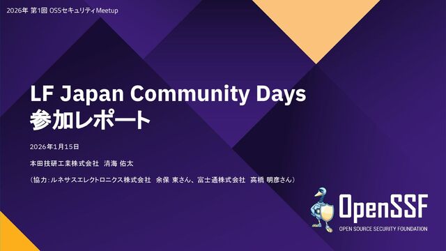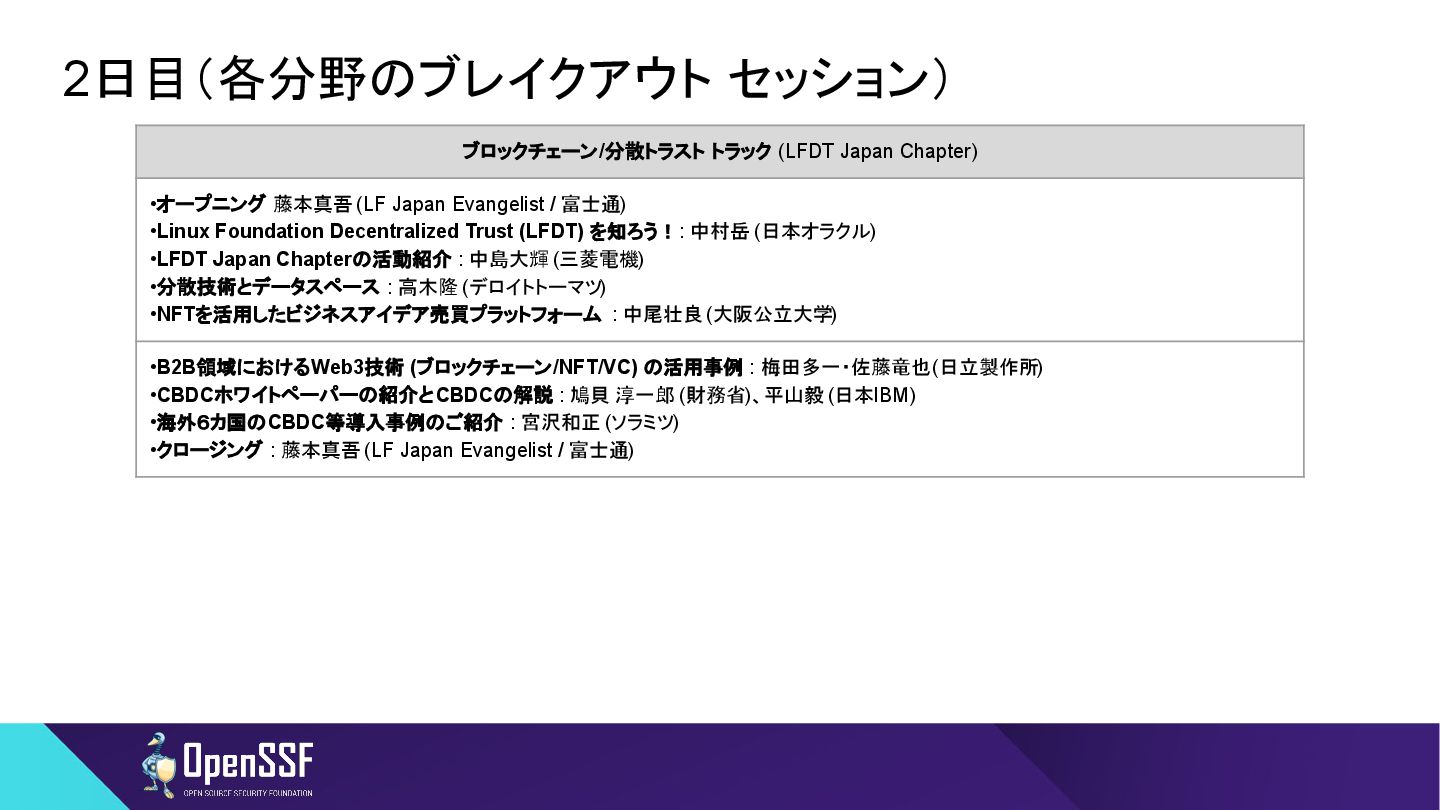 • SBOM Format ・代表的なSBOMフォーマット(SPDX/CycloneDX/SWID) ・各フォーマットの比較 ・Minimum Elements by NTIA とMinimum Elements by CISA • SBOM Basics ・SBOMの基礎 ・SBOMが必要になった背景 ・SBOMの利用シーンと作成 Are you ready for CRA ? – SBOM – 大和田清志(ソシオネクスト) [資料リンク] OSSガバナンス トラック 渡邊歩(日立ソリューションズ) [資料リンク] 余保 束(ルネサスエレクトロニクス) [資料リンク]