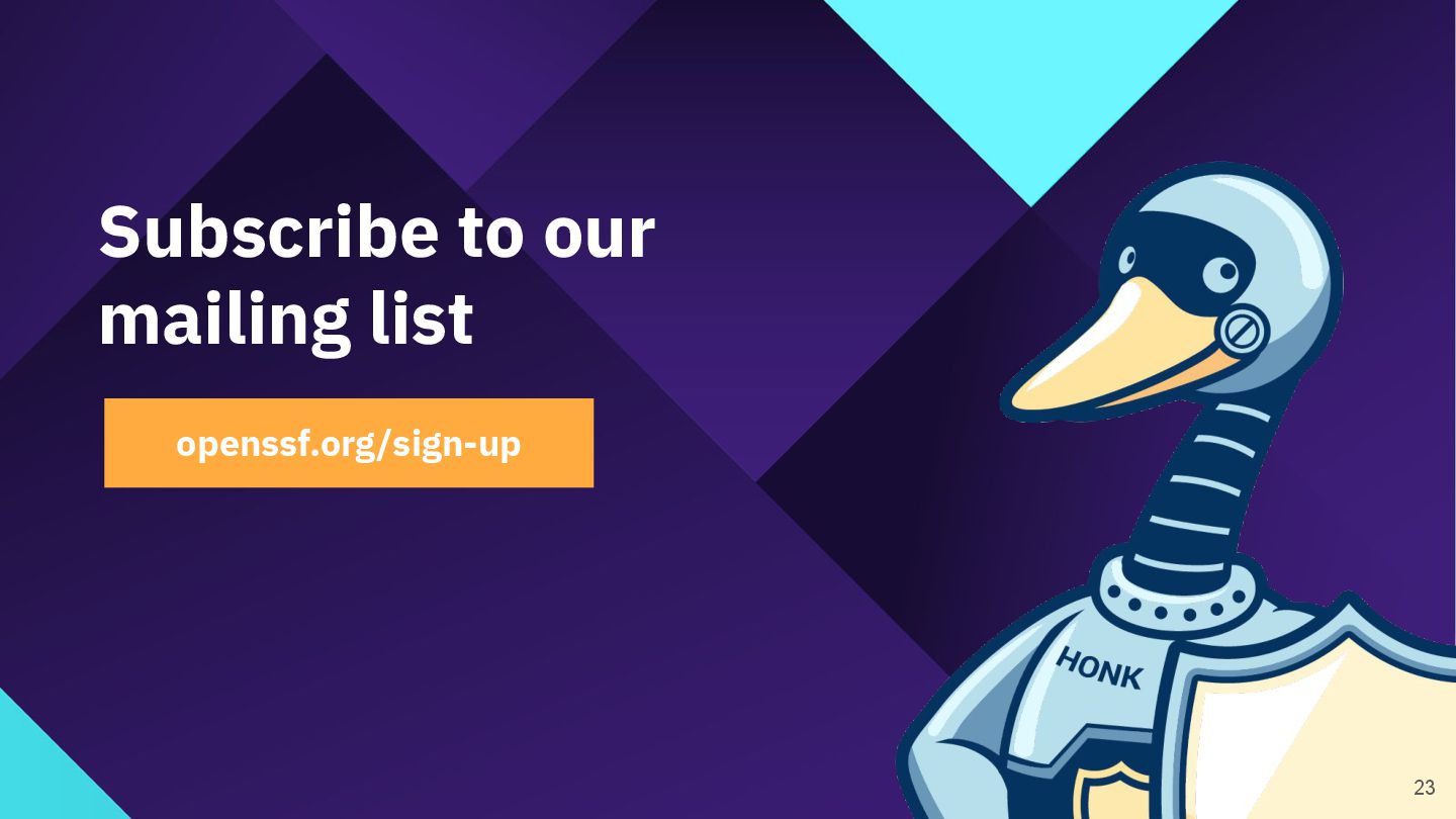 Meeting (see Public Calendar) Collaborate on Slack Contribute on GitHub Become an Organizational Member Keep up to date by subscribing to the OpenSSF Mailing List 21