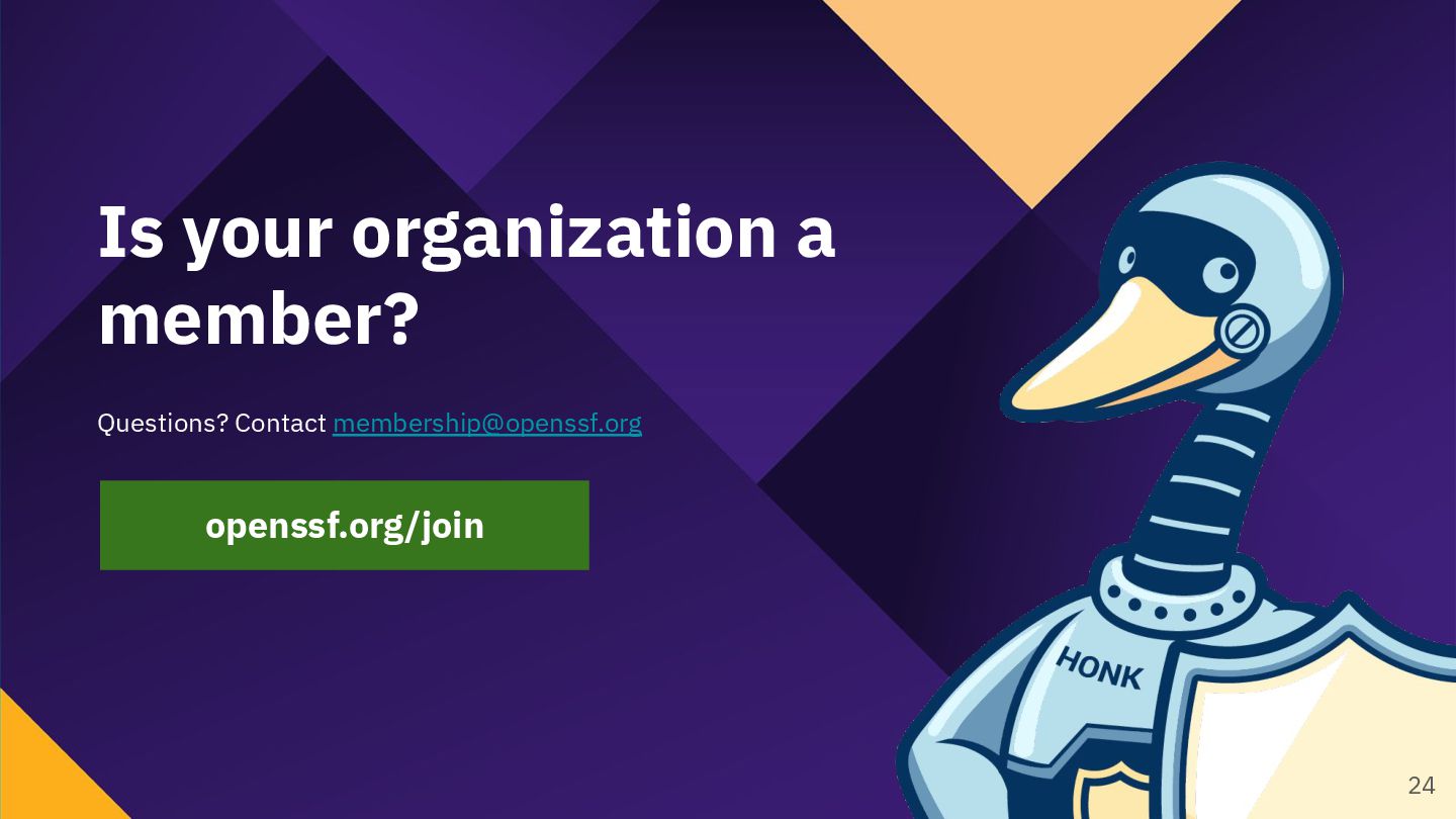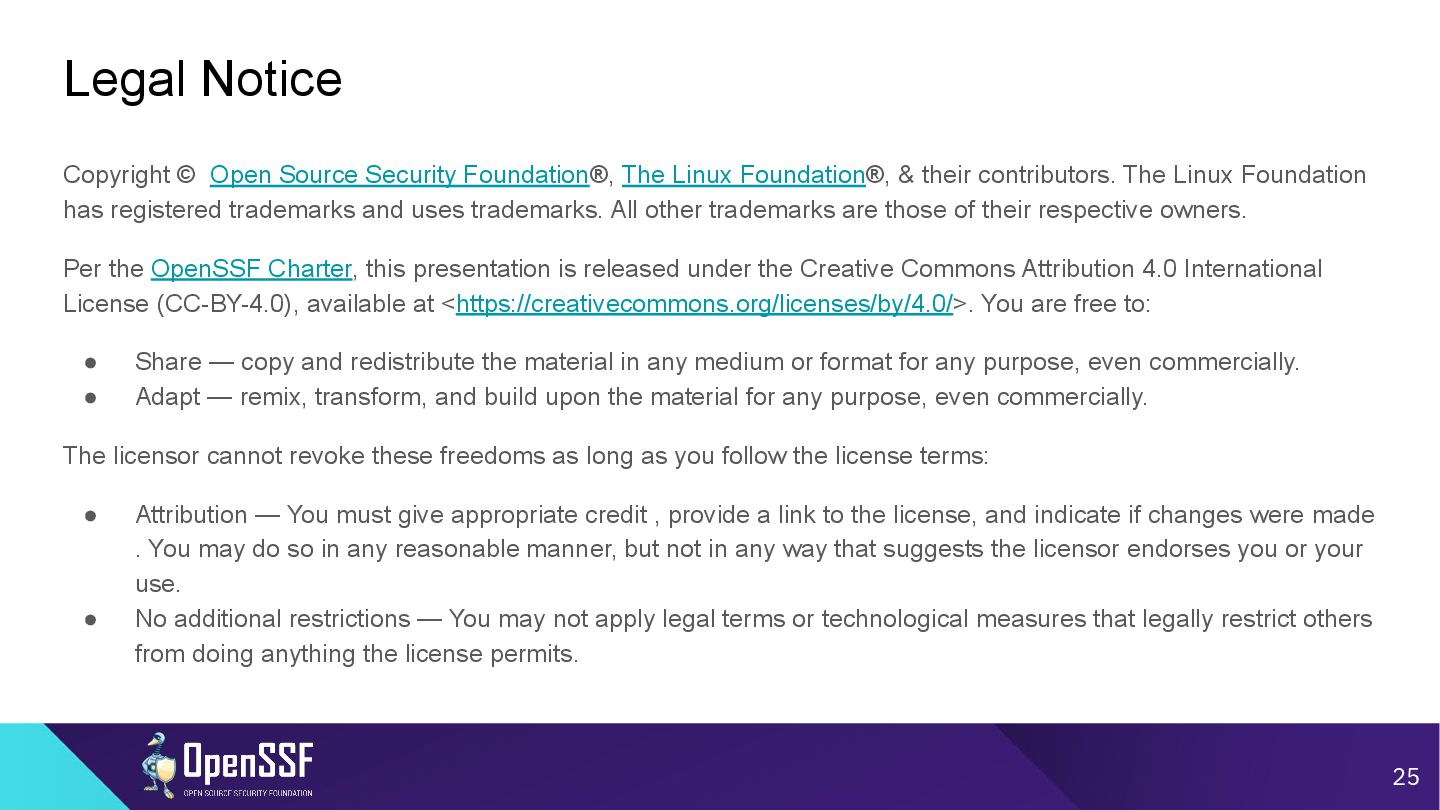 Foundation®, & their contributors. The Linux Foundation has registered trademarks and uses trademarks. All other trademarks are those of their respective owners. Per the OpenSSF Charter, this presentation is released under the Creative Commons Attribution 4.0 International License (CC-BY-4.0), available at <https://creativecommons.org/licenses/by/4.0/>. You are free to: • Share — copy and redistribute the material in any medium or format for any purpose, even commercially. • Adapt — remix, transform, and build upon the material for any purpose, even commercially. The licensor cannot revoke these freedoms as long as you follow the license terms: • Attribution — You must give appropriate credit , provide a link to the license, and indicate if changes were made . You may do so in any reasonable manner, but not in any way that suggests the licensor endorses you or your use. • No additional restrictions — You may not apply legal terms or technological measures that legally restrict others from doing anything the license permits. 25