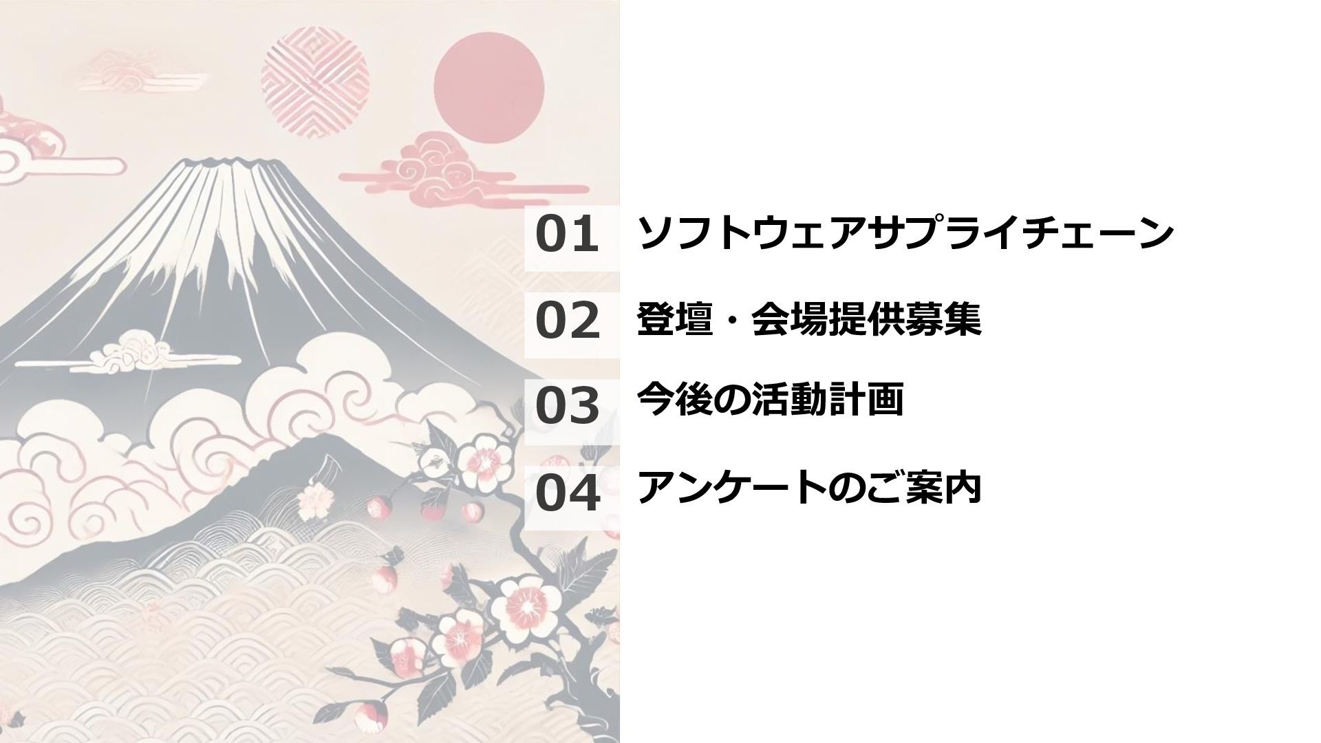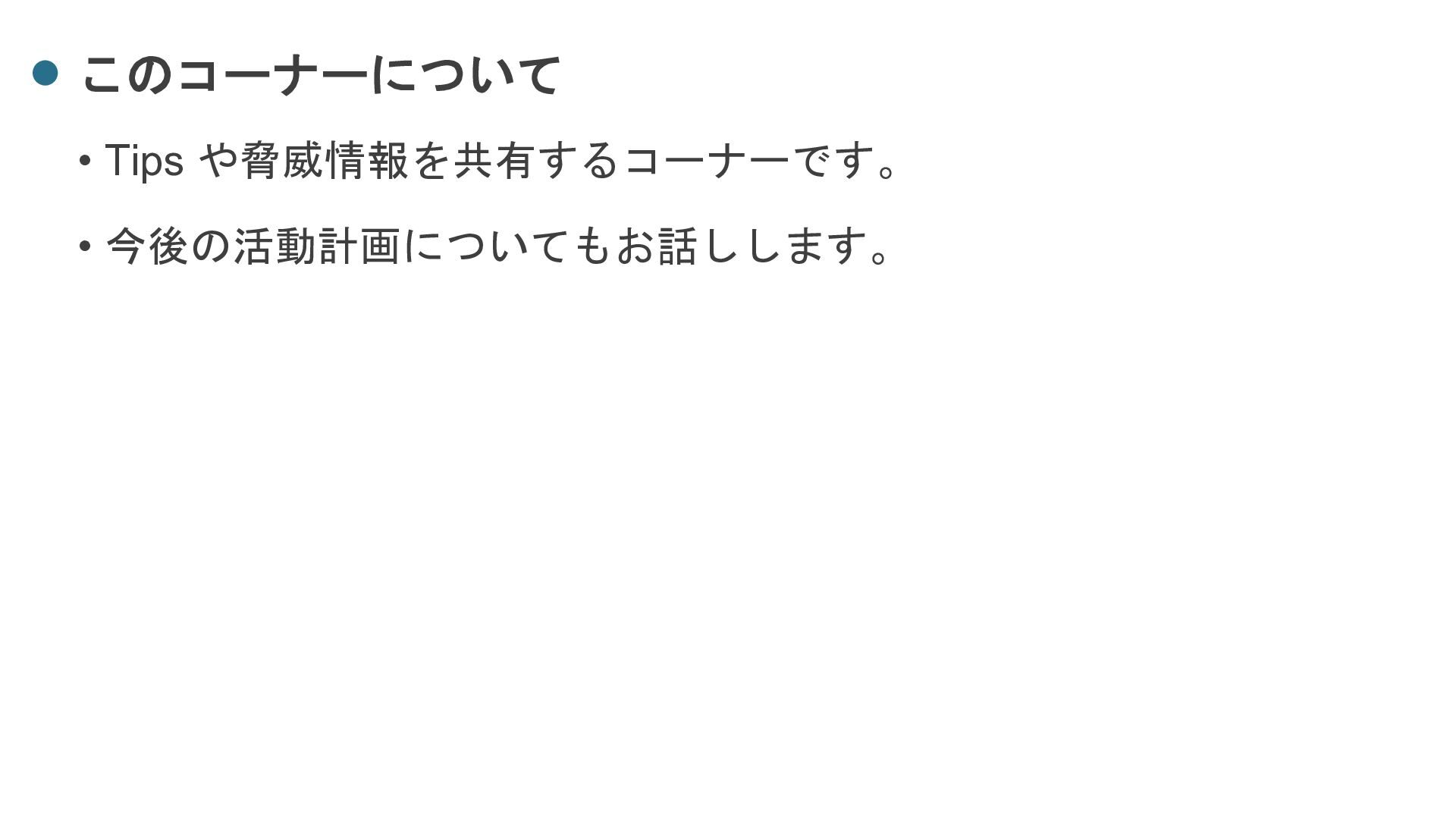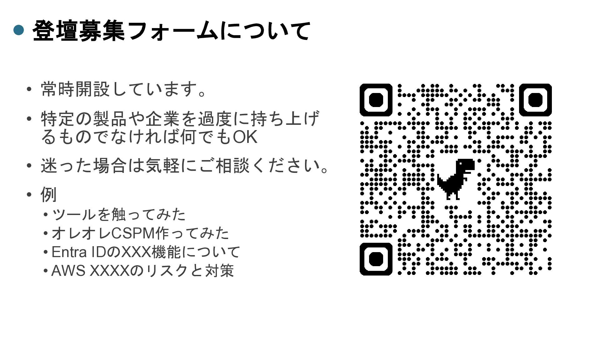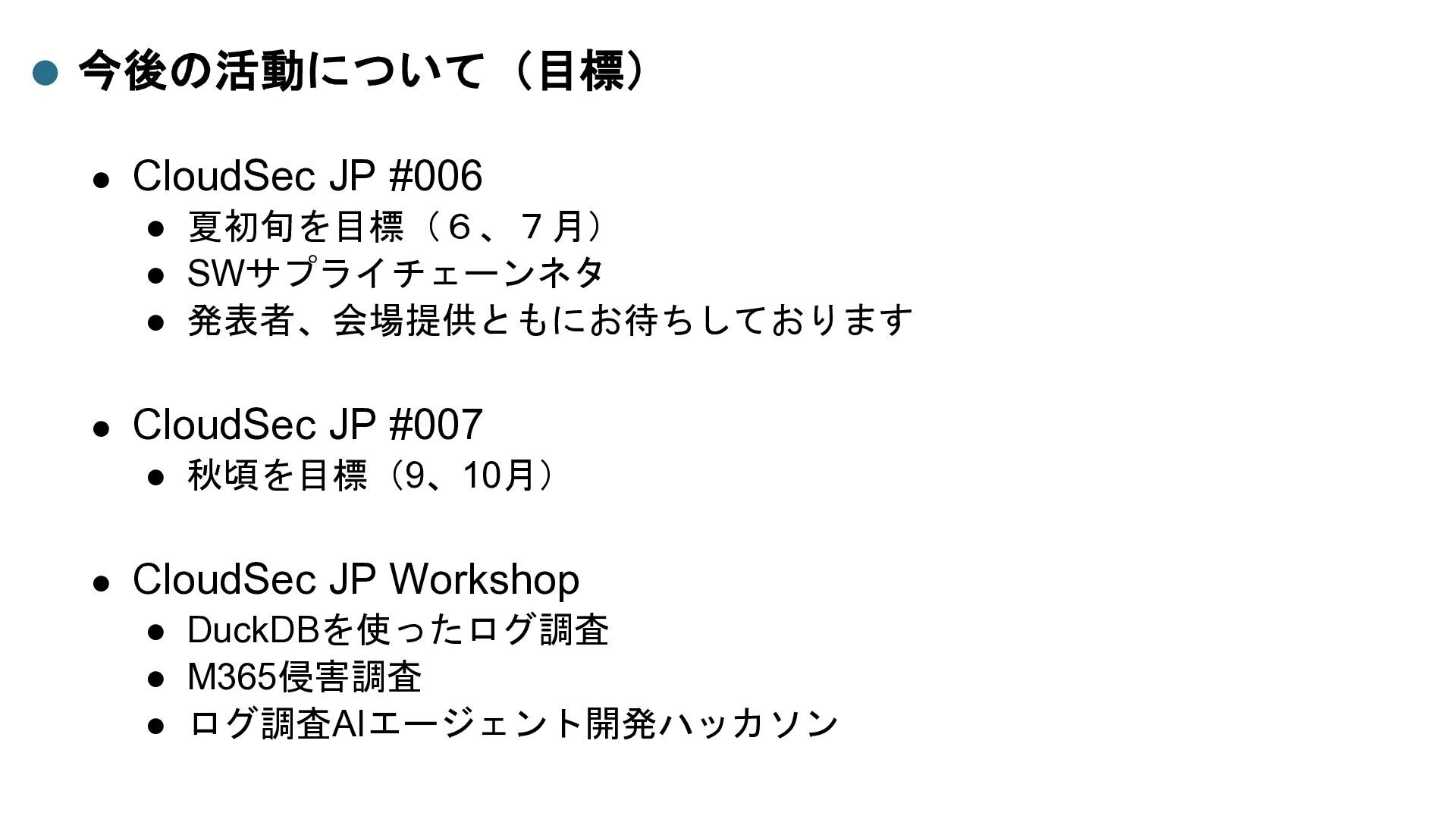 ⚫ 発表者、会場提供ともにお待ちしております ⚫ CloudSec JP #007 ⚫ 秋頃を目標(9、10月) ⚫ CloudSec JP Workshop ⚫ DuckDBを使ったログ調査 ⚫ M365侵害調査 ⚫ ログ調査AIエージェント開発ハッカソン