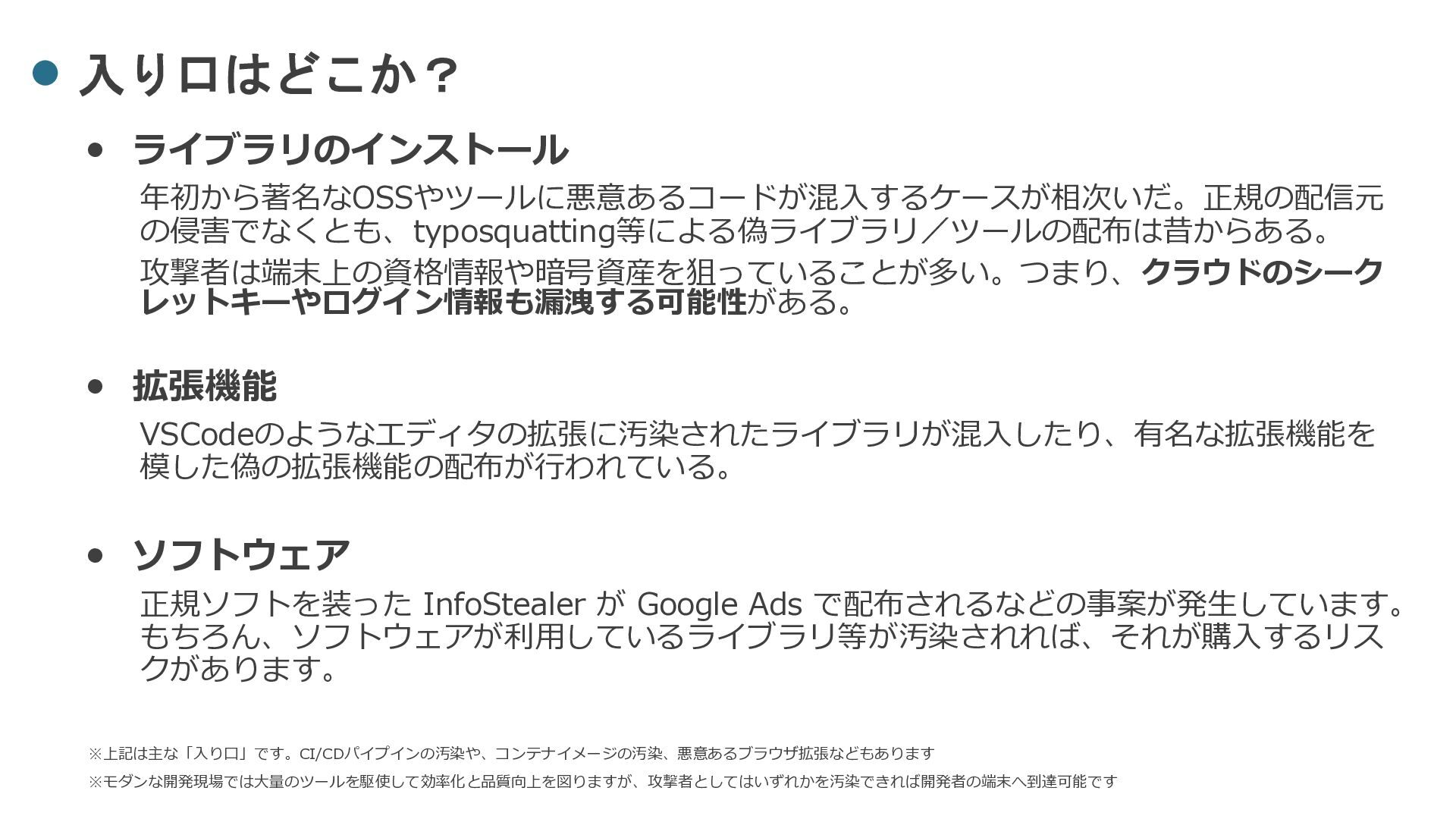 VSCodeのようなエディタの拡張に汚染されたライブラリが混入したり、有名な拡張機能を 模した偽の拡張機能の配布が行われている。 • ソフトウェア 正規ソフトを装った InfoStealer が Google Ads で配布されるなどの事案が発生しています。 もちろん、ソフトウェアが利用しているライブラリ等が汚染されれば、それが購入するリス クがあります。 ※上記は主な「入り口」です。CI/CDパイプインの汚染や、コンテナイメージの汚染、悪意あるブラウザ拡張などもあります ※モダンな開発現場では大量のツールを駆使して効率化と品質向上を図りますが、攻撃者としてはいずれかを汚染できれば開発者の端末へ到達可能です
