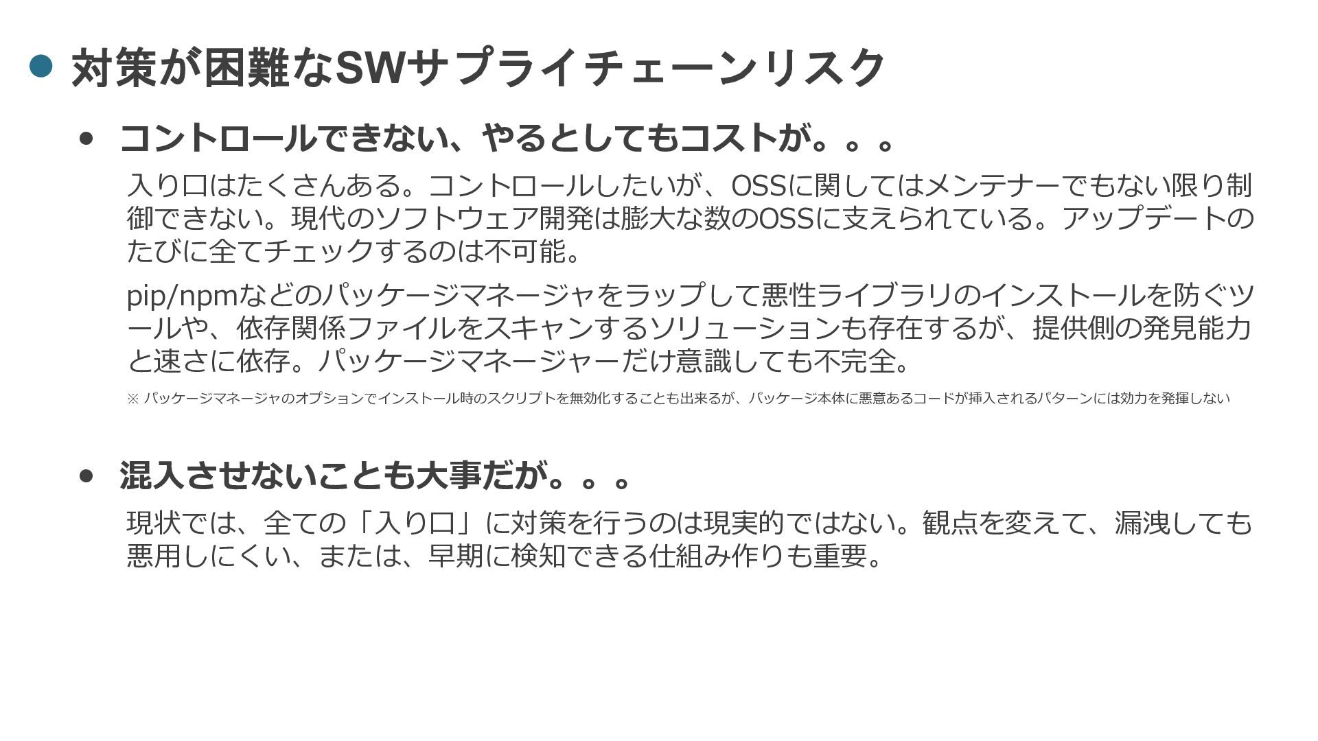 ※ パッケージマネージャのオプションでインストール時のスクリプトを無効化することも出来るが、パッケージ本体に悪意あるコードが挿入されるパターンには効力を発揮しない • 混入させないことも大事だが。。。 現状では、全ての「入り口」に対策を行うのは現実的ではない。観点を変えて、漏洩しても 悪用しにくい、または、早期に検知できる仕組み作りも重要。