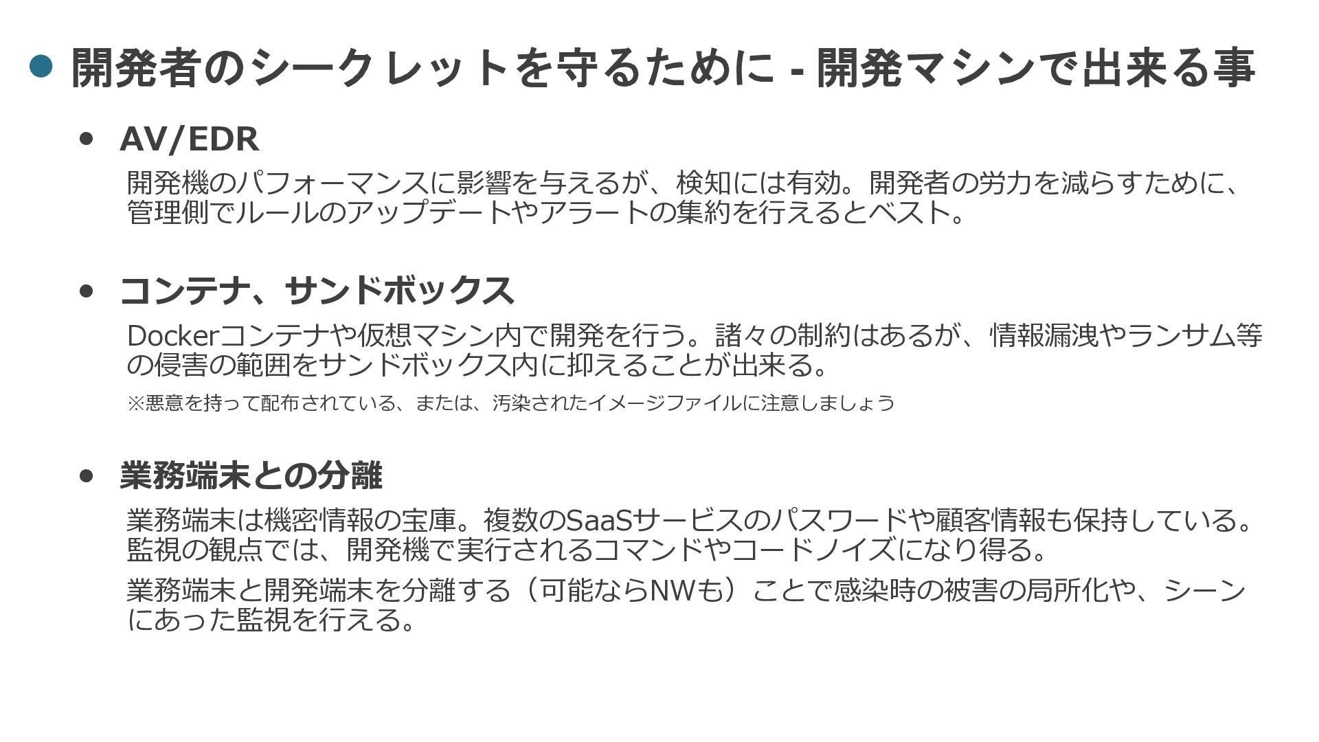 Dockerコンテナや仮想マシン内で開発を行う。諸々の制約はあるが、情報漏洩やランサム等 の侵害の範囲をサンドボックス内に抑えることが出来る。 ※悪意を持って配布されている、または、汚染されたイメージファイルに注意しましょう • 業務端末との分離 業務端末は機密情報の宝庫。複数のSaaSサービスのパスワードや顧客情報も保持している。 監視の観点では、開発機で実行されるコマンドやコードノイズになり得る。 業務端末と開発端末を分離する(可能ならNWも)ことで感染時の被害の局所化や、シーン にあった監視を行える。